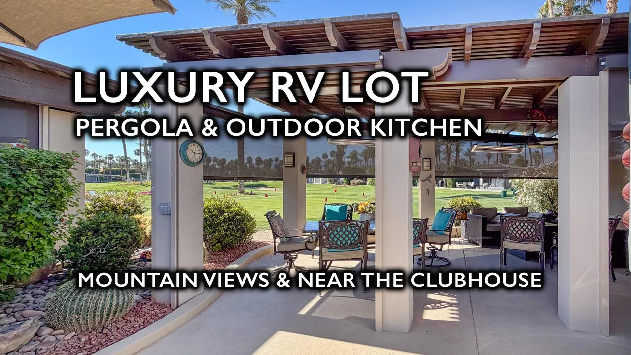 The Cooldeck-coated RV pad keeps the surface comfortable and easily accommodates a 45-foot coach with easy parking access. Furnishings include a wicker seating set with loveseat, chairs, fire table, dining tables with seating, custom covers for the kitchen and furniture, and two storage boxes. Lot 8 offers an exceptional combination of golf course access, mountain views, functional design, and prime location within one of the Coachella Valley’s premier Class A motorcoach resorts.