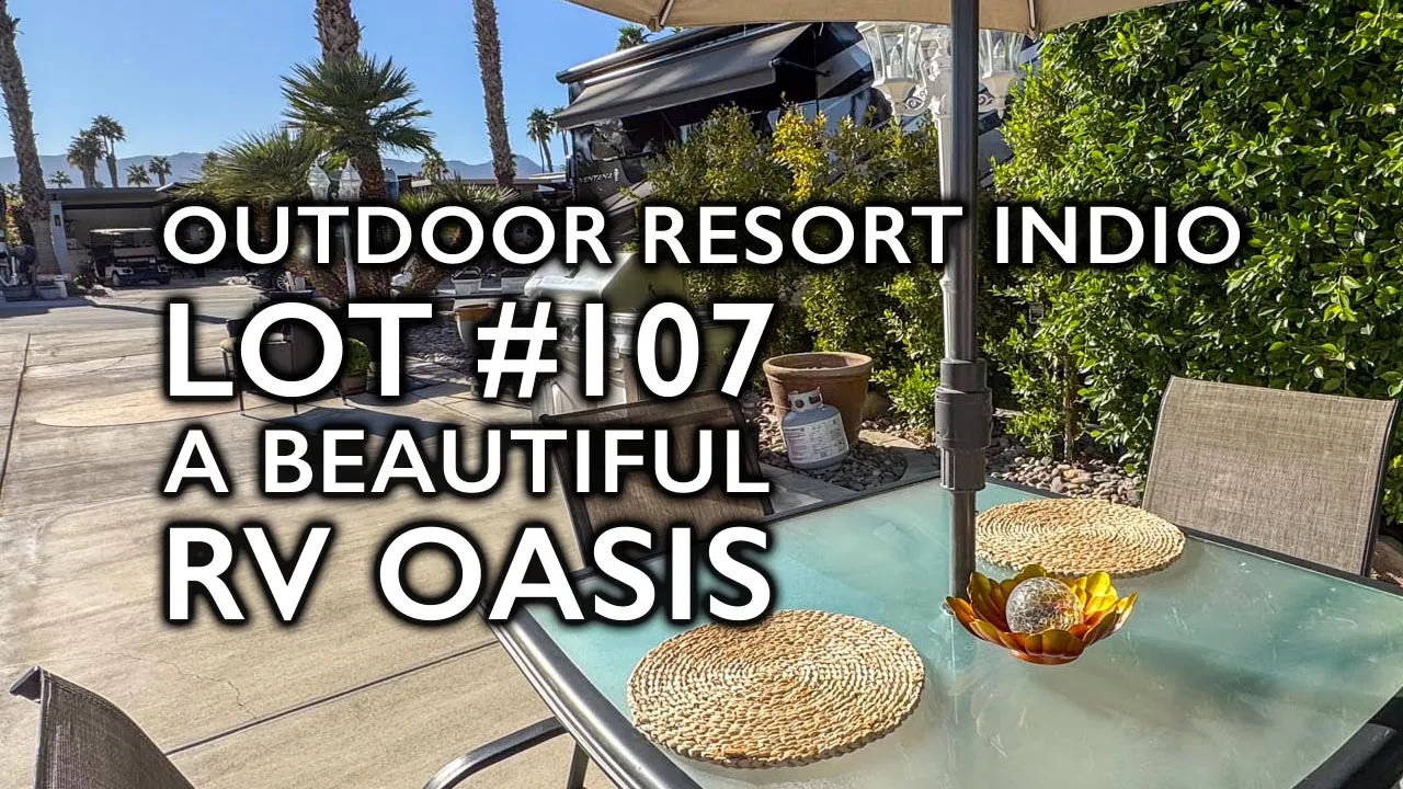 Lot 107 is your chance to create the perfect RV oasis at Outdoor Resort Indio, a premier Class A motorcoach resort. This west-facing perimeter lot offers the ideal balance of privacy and convenience, with evening sunsets to end your day in style. Enjoy the north-side ficus hedge for added seclusion and a tranquil water feature for quiet moments of relaxation. The lot is just a short walk to the clubhouse, café, owner’s lounge, pools, and golf course. Included furnishings: a dining table with four chairs, plus a rattan table and chairs—ready to enjoy today. ORI is more than a resort—it’s a friendly, active community with a vibrant calendar of events. A wonderful place to spend your winter, surrounded by amenities, activities, and like-minded RVers.