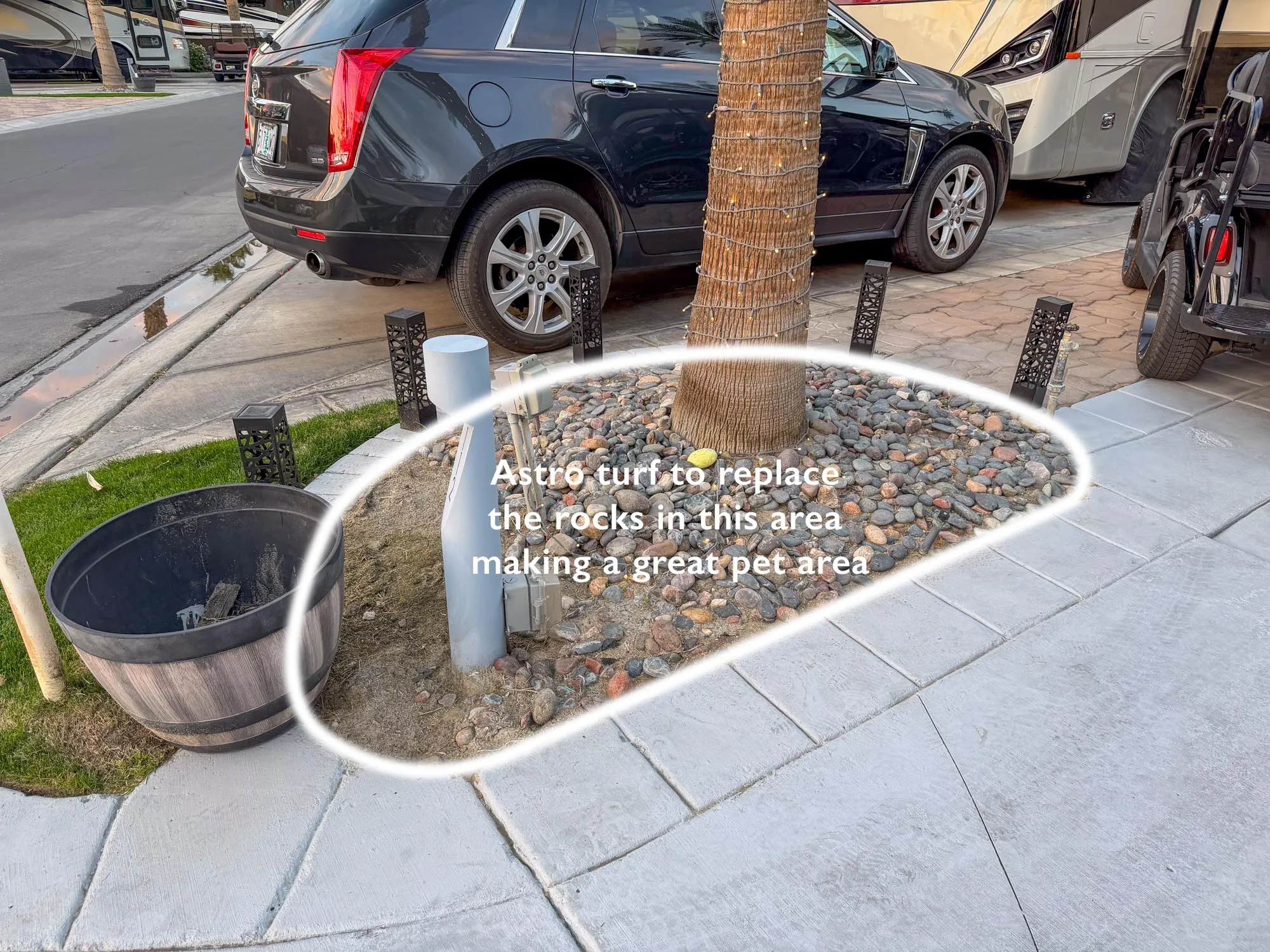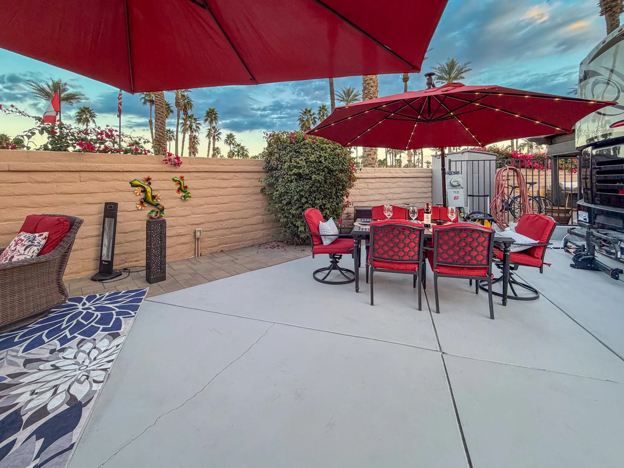 Lot 112 at Outdoor Resort Indio is a well-maintained, private RV lot offering comfort, functionality, and room to grow in a convenient resort location. Positioned along the wall near the resort entrance, this lot enjoys added privacy while still being close to amenities, with a nicely painted RV pad and pavers added to extend the lot both to the back and side, creating extra usable outdoor space.