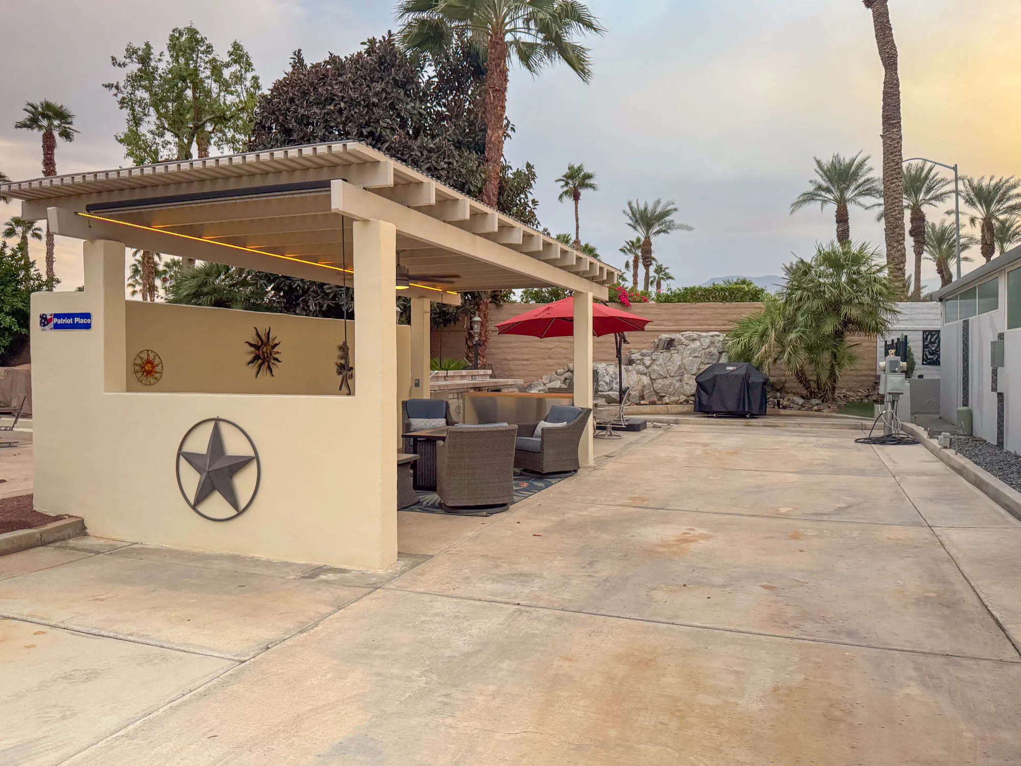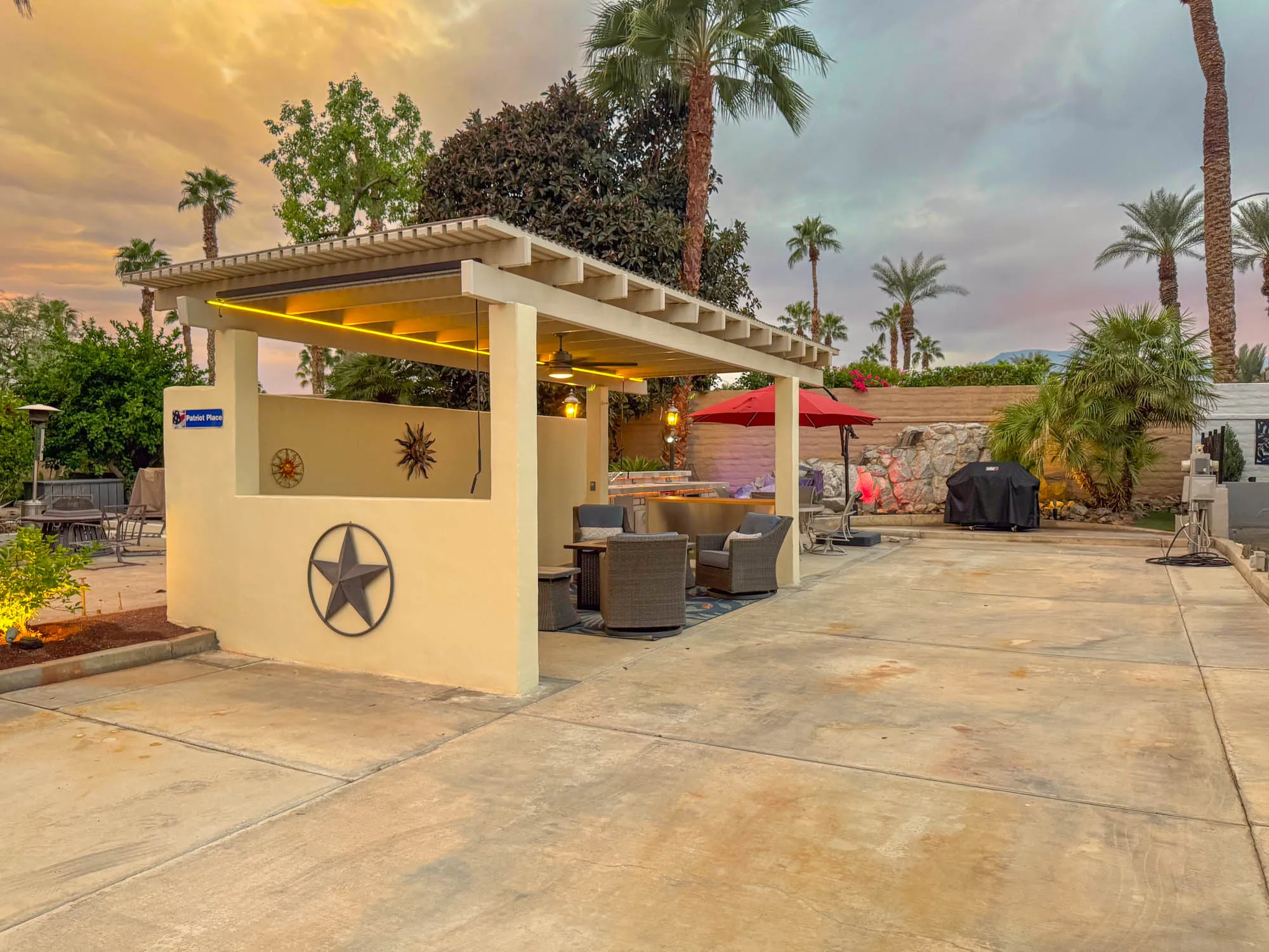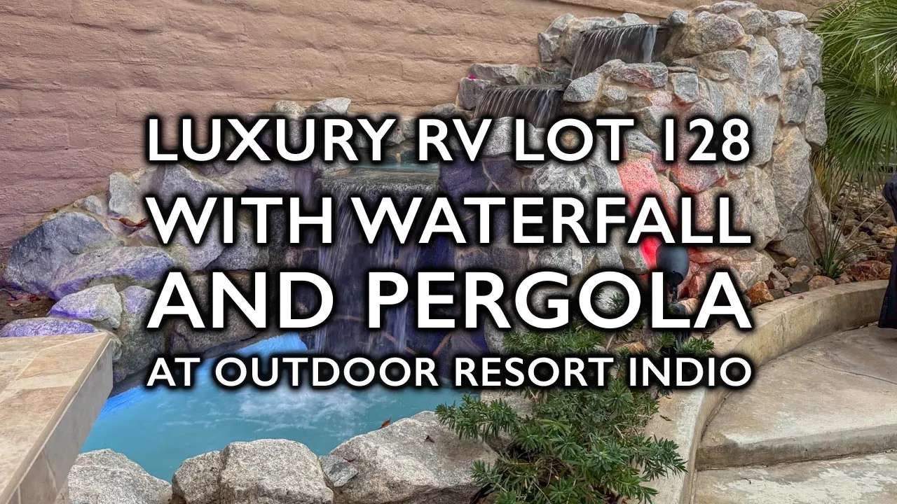 Enjoy the soothing ambient sound of the multi-level waterfall just behind the lot, creating a peaceful and private outdoor retreat. This beautifully appointed motorcoach lot features an Alumawood pergola with a new polycarbonate roof skin and a two-year-old privacy wall wired for a TV, expanding your outdoor living space. The medium outdoor kitchen with new Weber BBQ, custom covers, tile accents, and a ceiling fan makes entertaining easy. Thoughtful details include beautiful landscaping and a custom-designed pet area with a French drain, perfect for pet owners. Well-shaded with warm evening lighting, the lot offers comfort day and night. Ideally located across from the satellite pool, hot tub, sauna, and laundry, it also benefits from extra guest parking and restrooms just steps away, making it perfect for hosting friends. Priced to sell as-is, this property delivers strong value in a premier luxury Class A motorcoach resort.