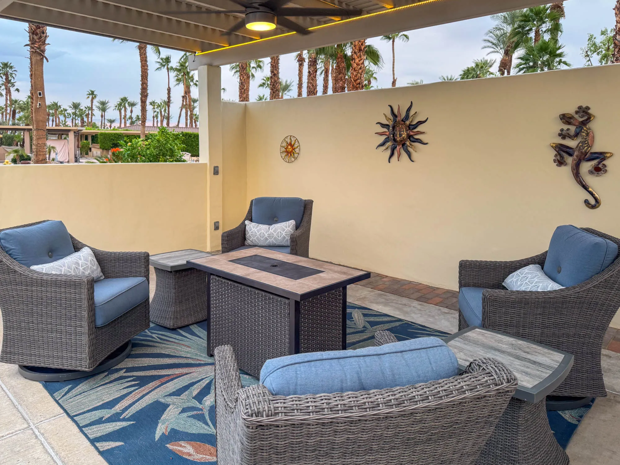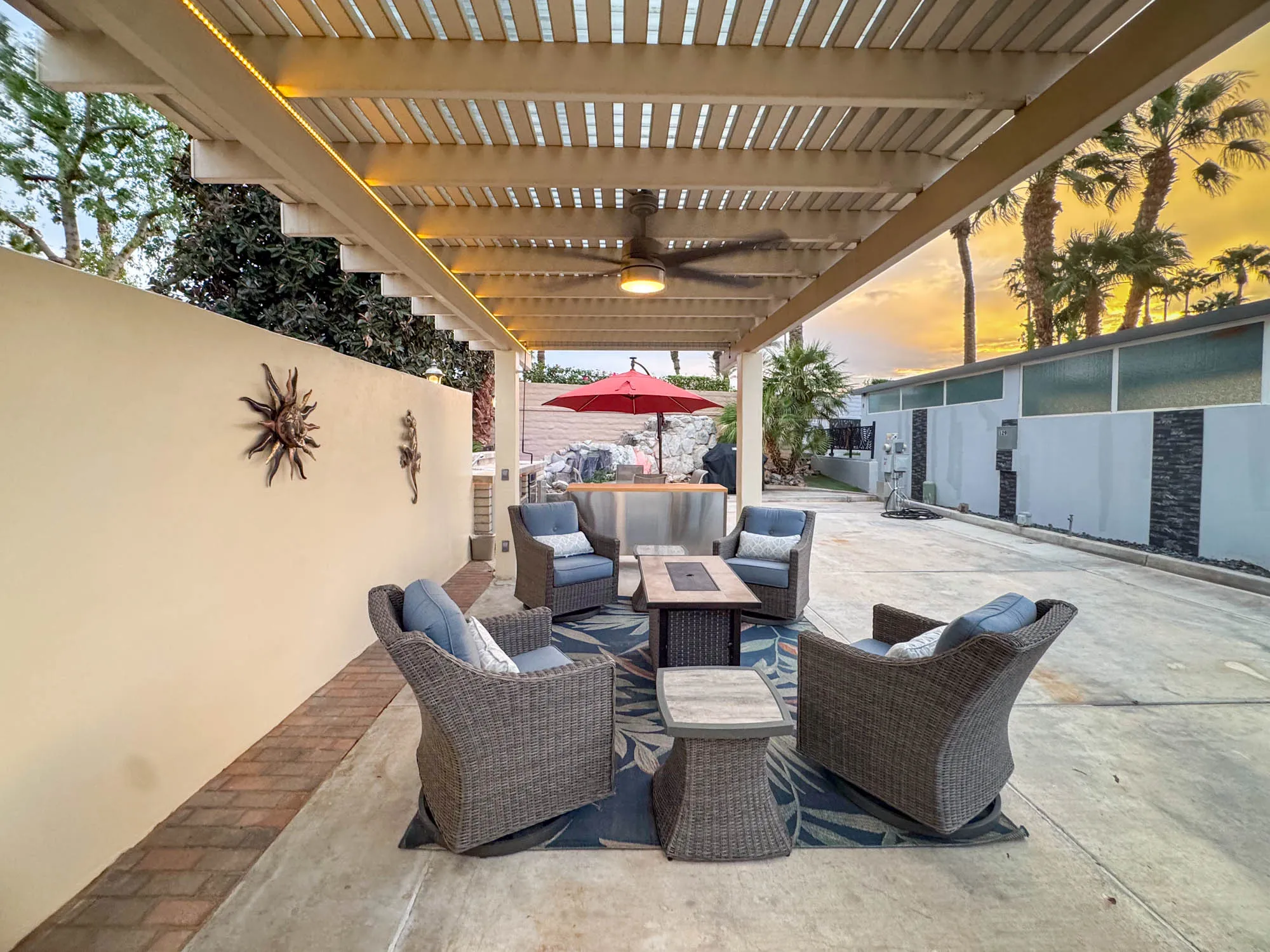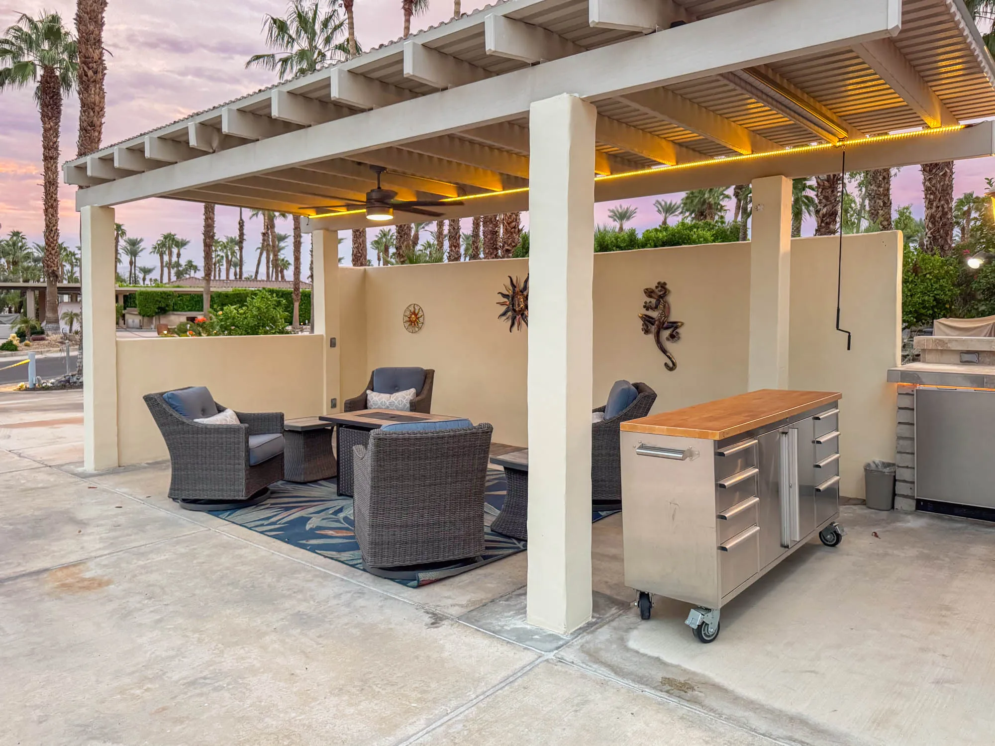 Enjoy the soothing ambient sound of the multi-level waterfall just behind the lot, creating a peaceful and private outdoor retreat. This beautifully appointed motorcoach lot features an Alumawood pergola with a new polycarbonate roof skin and a two-year-old privacy wall wired for a TV, expanding your outdoor living space. The medium outdoor kitchen with new Weber BBQ, custom covers, tile accents, and a ceiling fan makes entertaining easy. Thoughtful details include beautiful landscaping and a custom-designed pet area with a French drain, perfect for pet owners. Well-shaded with warm evening lighting, the lot offers comfort day and night. Ideally located across from the satellite pool, hot tub, sauna, and laundry, it also benefits from extra guest parking and restrooms just steps away, making it perfect for hosting friends. Priced to sell as-is, this property delivers strong value in a premier luxury Class A motorcoach resort.