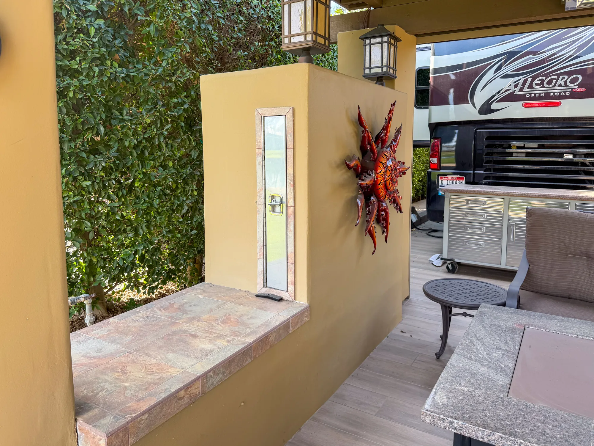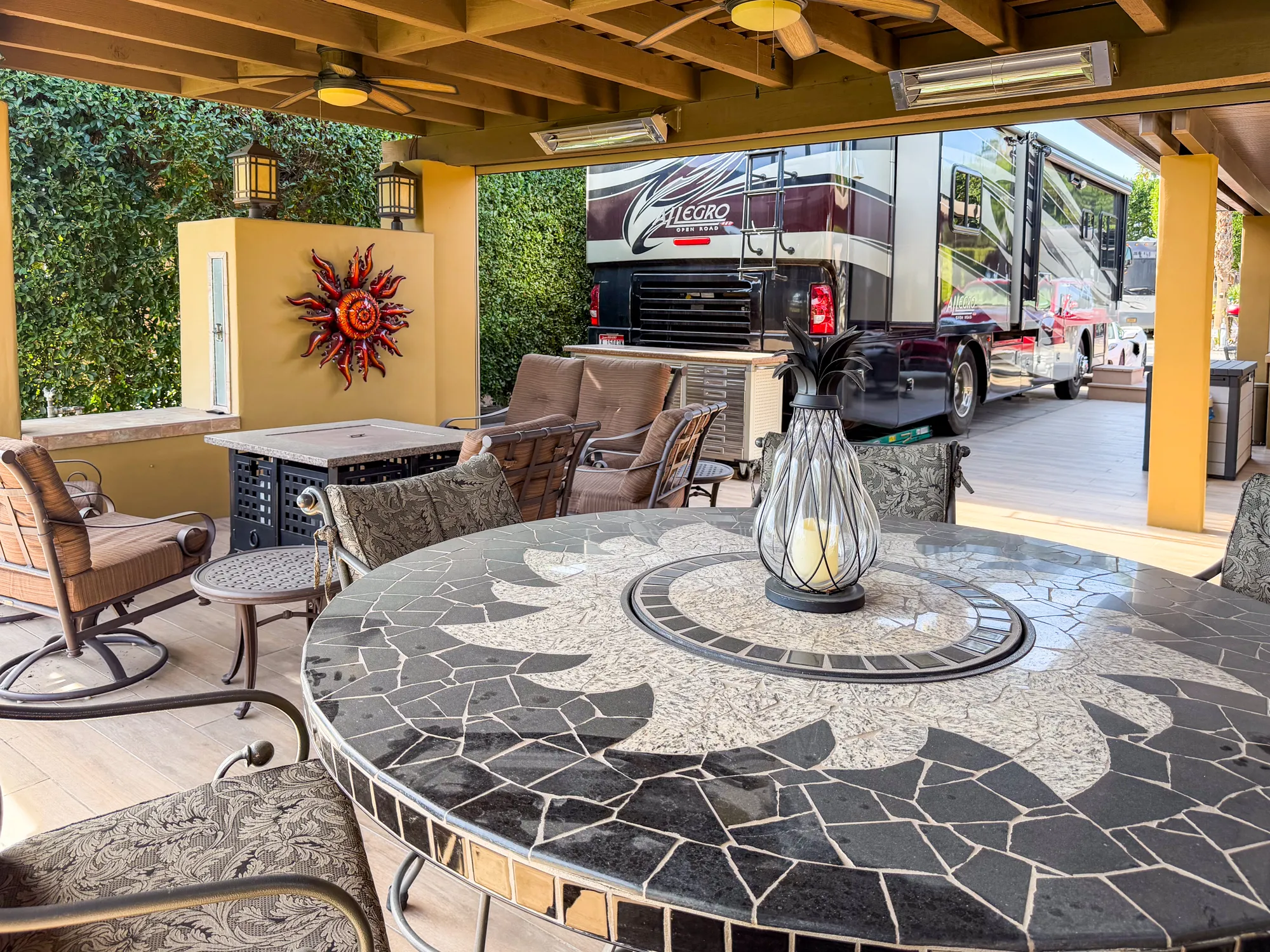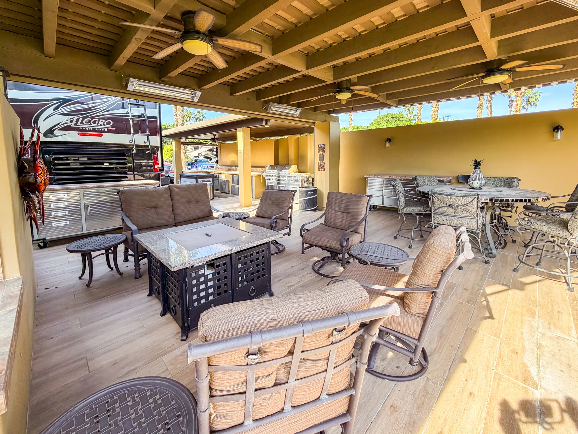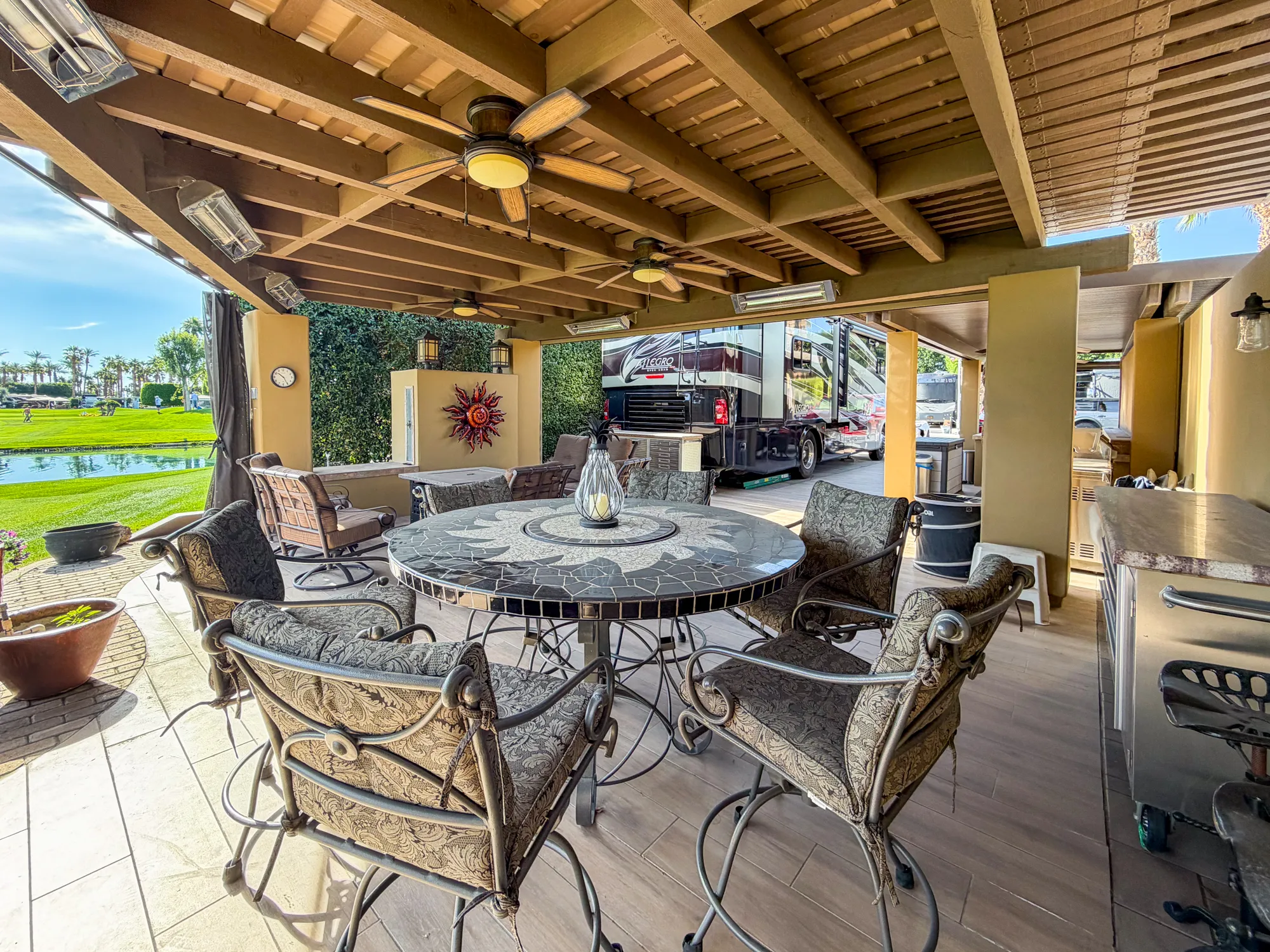 The elegance continues with a covered pergola in the back, equipped with three lighted fans, five 240V electric heaters, and electric screens for privacy and comfort. Relax in the stylish seating area featuring a glass dining table, fire pit table, swivel chairs, loveseat, and side tables. A pull-out 49-inch Samsung Smart TV with a soundbar ensures top-notch entertainment, with additional storage behind the TV structure. The lot is finished with stained concrete for coach, car, and golf cart parking, porcelain tile, and a lit privacy wall along the north side. Meyer lemon and Minneola tangelo trees add charm, while flowerpots, storage solutions, and custom covers make this an extraordinary retreat for the ultimate luxury RV lifestyle.
