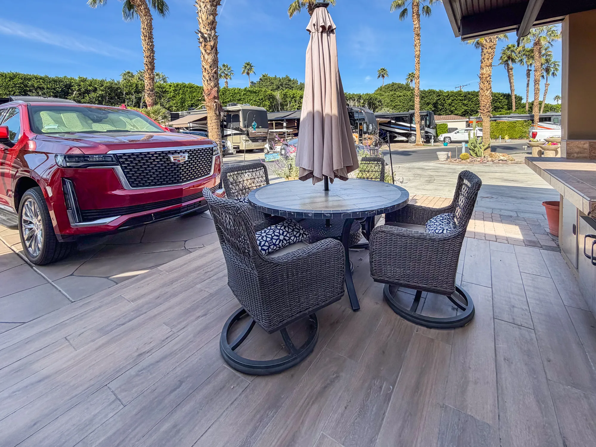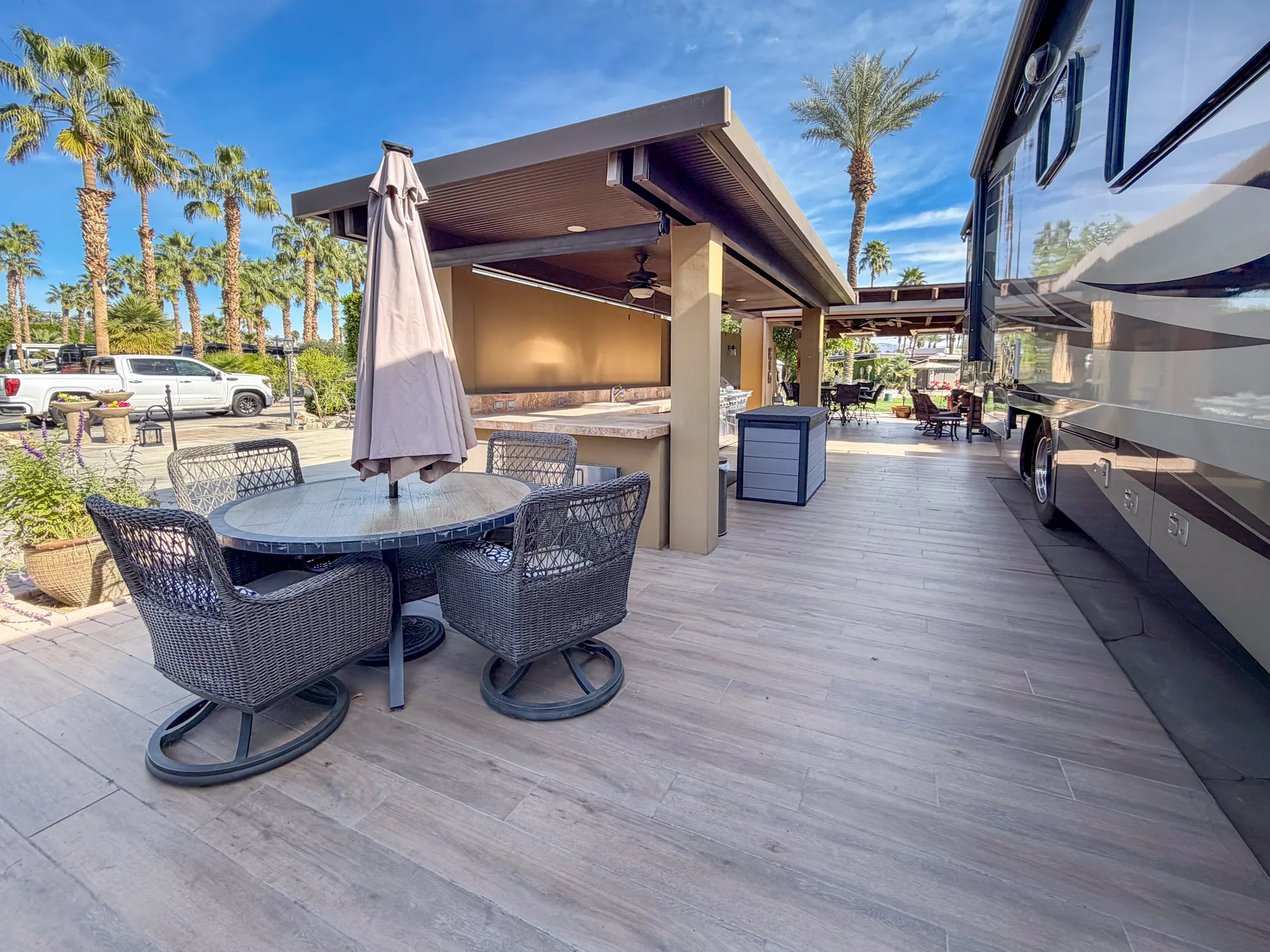 East-facing and perched on the 14th tee box, this luxury RV lot at Outdoor Resort Indio offers stunning golf course and mountain views, with morning sun and cool afternoon shade. Designed for the discerning RVer, the lot features a fully equipped outdoor kitchen with an oven, electric cooktop, deep stainless sink, garbage disposal, drawer dishwasher, small refrigerator, and ample storage under "L"-shaped counters. A pergola above the kitchen is fitted with two lighted fans, three pot lights, and a manual shade, creating a perfect space for outdoor dining. A Jenn-Air BBQ with cooktop and oven adds even more culinary versatility.