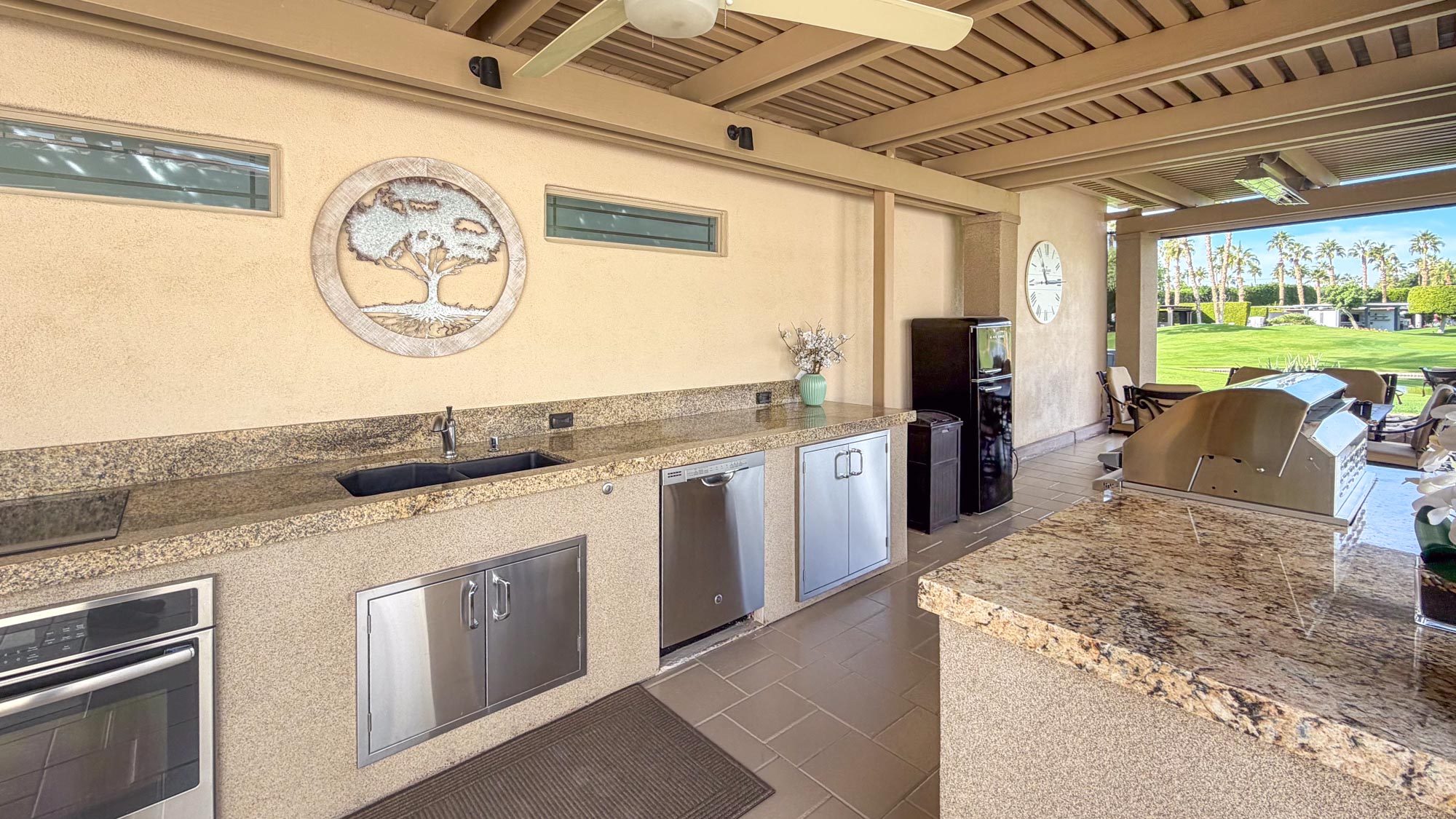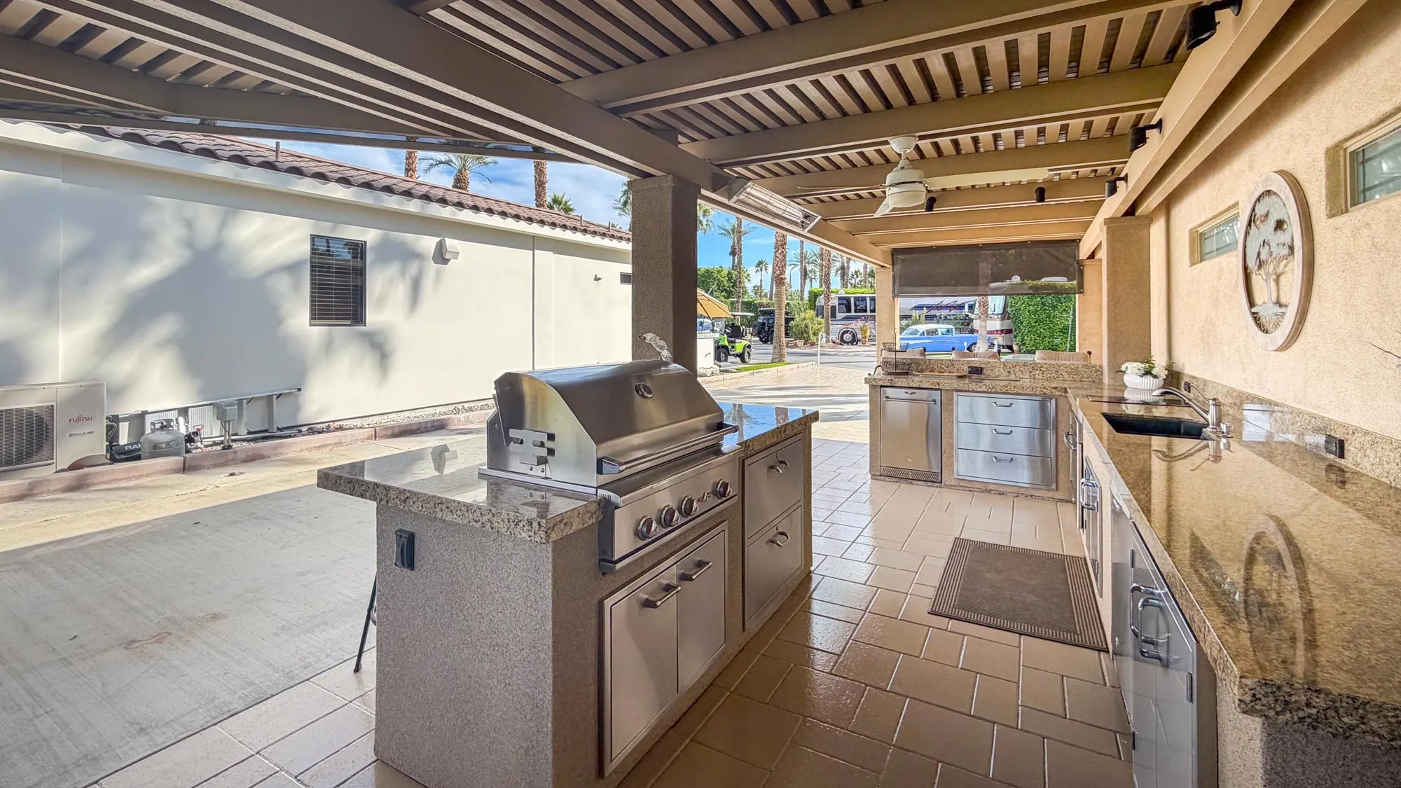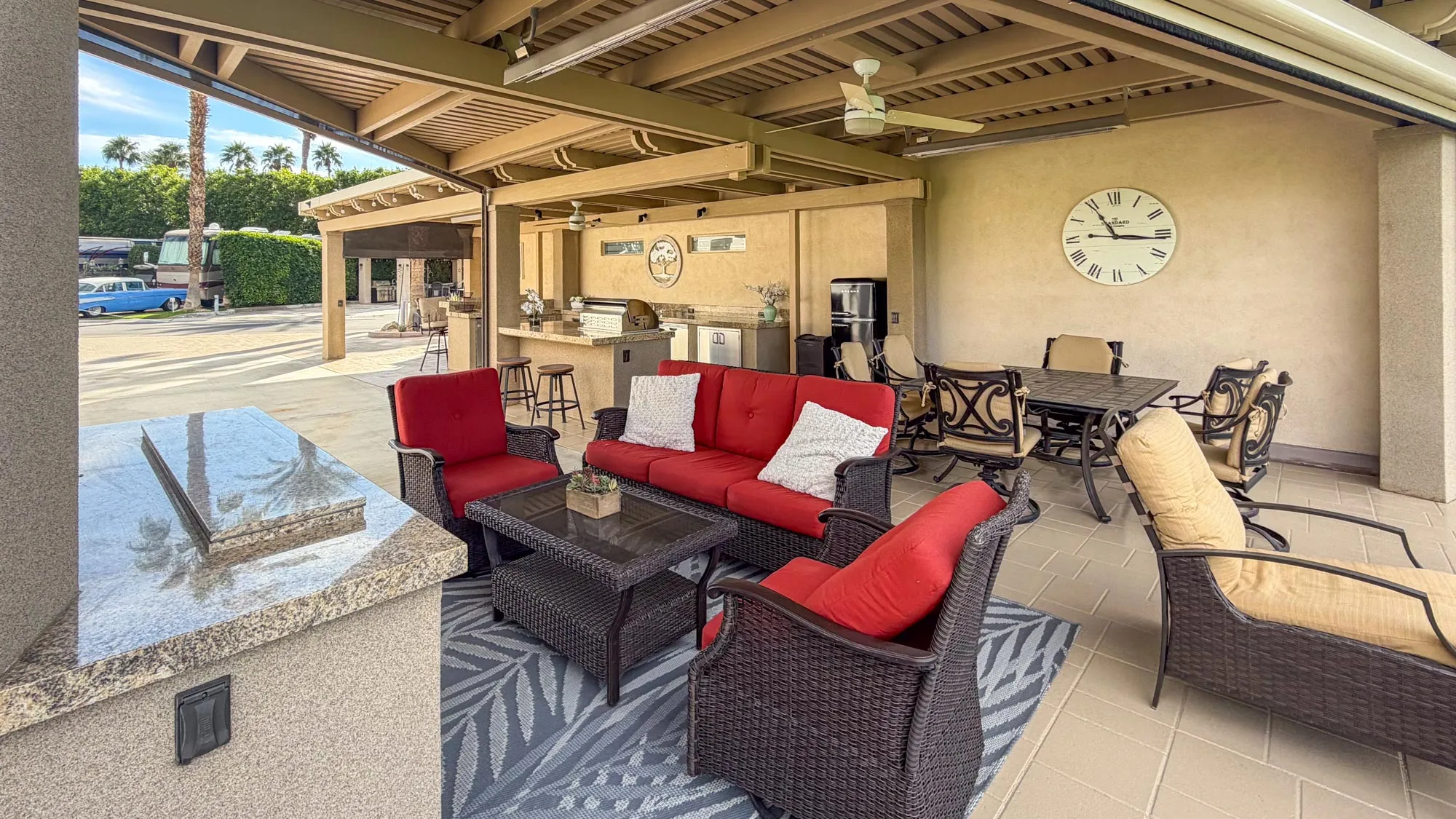 The outdoor kitchen and entertainment space are a dream for entertainers, featuring over 24 feet of granite countertops, a 7-foot island with a built-in bar, a 32-inch BBQ, GE convection oven, full-size dishwasher, commercial-grade under-counter refrigerator and brand new cooktop. The furnished space includes a dining table for eight, a patio couch, swivel chairs, and bar stools. A full stucco privacy wall with inset frosted windows enhances seclusion, while the entertainment center boasts a new pop-up 50-inch TV. Comfort is ensured with two ceiling fans, three electric heaters, and two motorized drop-down screens, creating the perfect environment for any occasion. With ambient lighting and stylish finishes, this lot offers an exceptional blend of luxury and functionality, ideal for embracing the RV lifestyle in comfort and style.