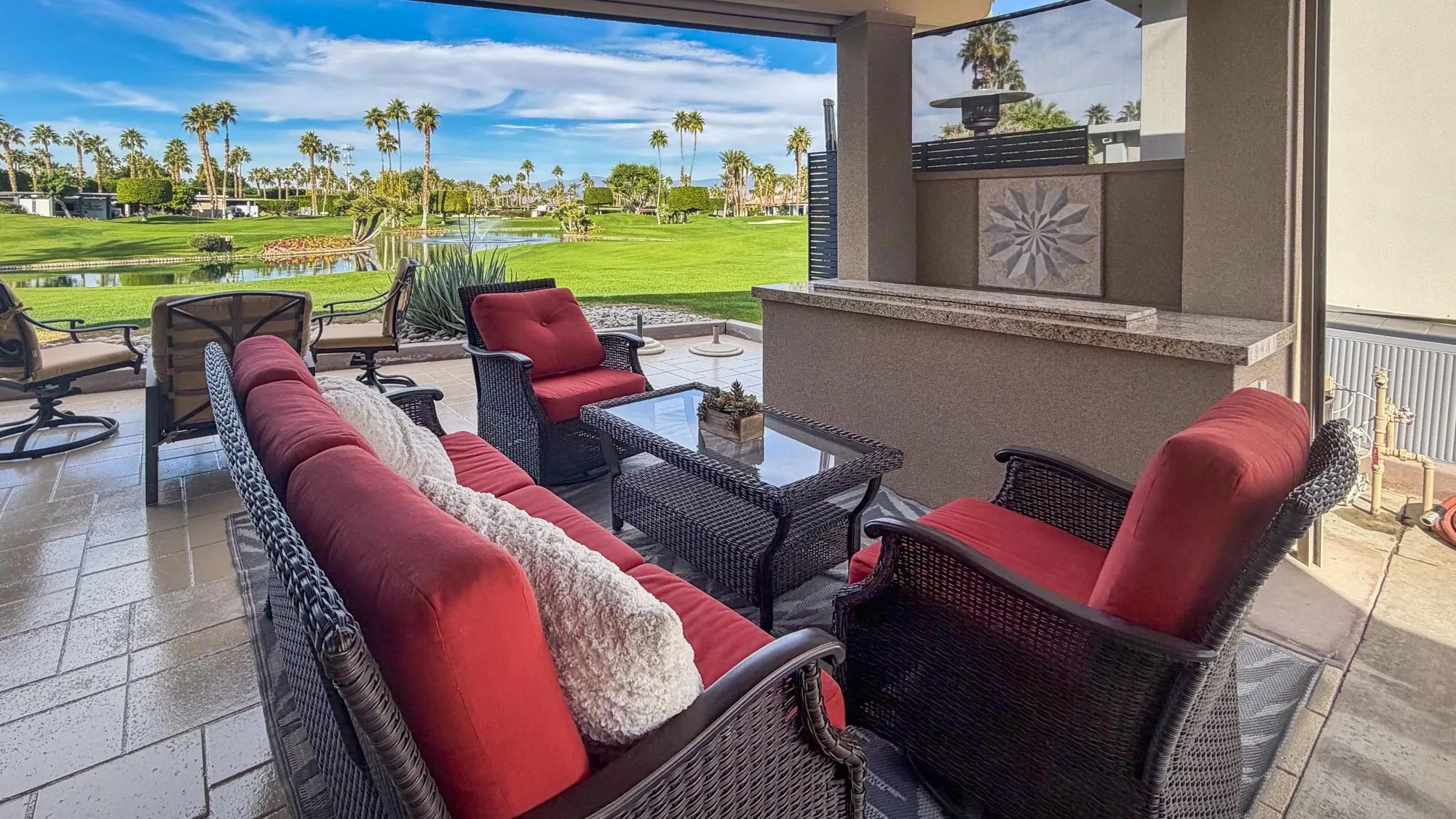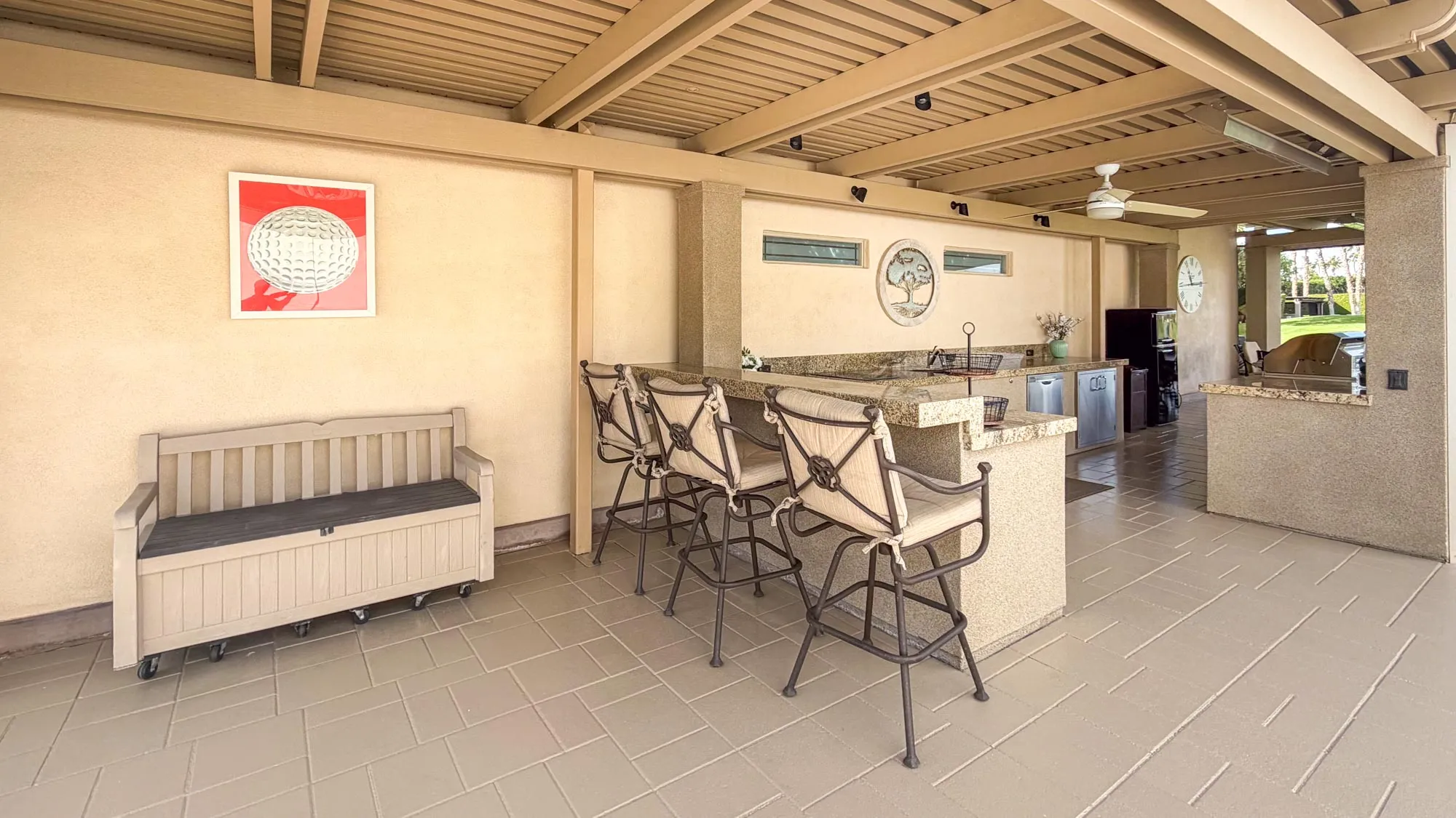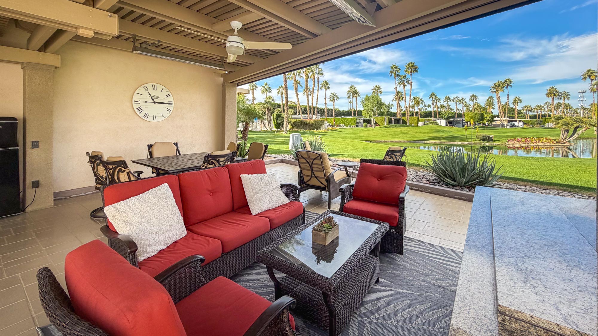 The outdoor kitchen and entertainment space are a dream for entertainers, featuring over 24 feet of granite countertops, a 7-foot island with a built-in bar, a 32-inch BBQ, GE convection oven, full-size dishwasher, commercial-grade under-counter refrigerator and brand new cooktop. The furnished space includes a dining table for eight, a patio couch, swivel chairs, and bar stools. A full stucco privacy wall with inset frosted windows enhances seclusion, while the entertainment center boasts a new pop-up 50-inch TV. Comfort is ensured with two ceiling fans, three electric heaters, and two motorized drop-down screens, creating the perfect environment for any occasion. With ambient lighting and stylish finishes, this lot offers an exceptional blend of luxury and functionality, ideal for embracing the RV lifestyle in comfort and style.