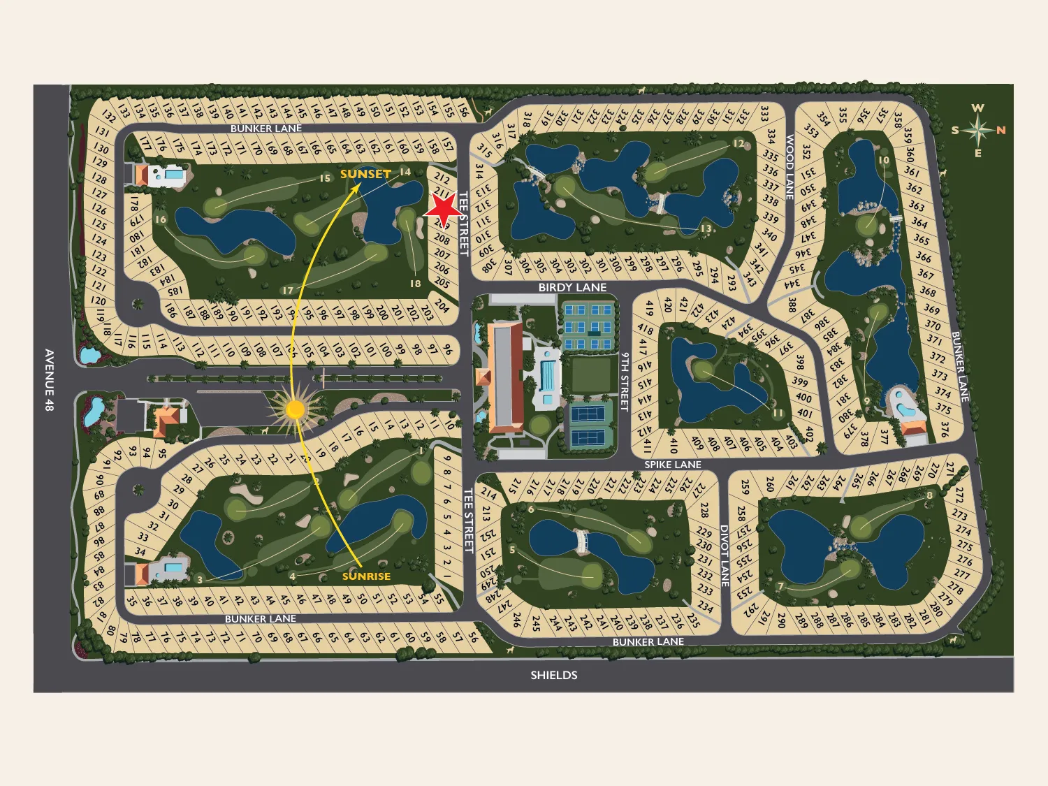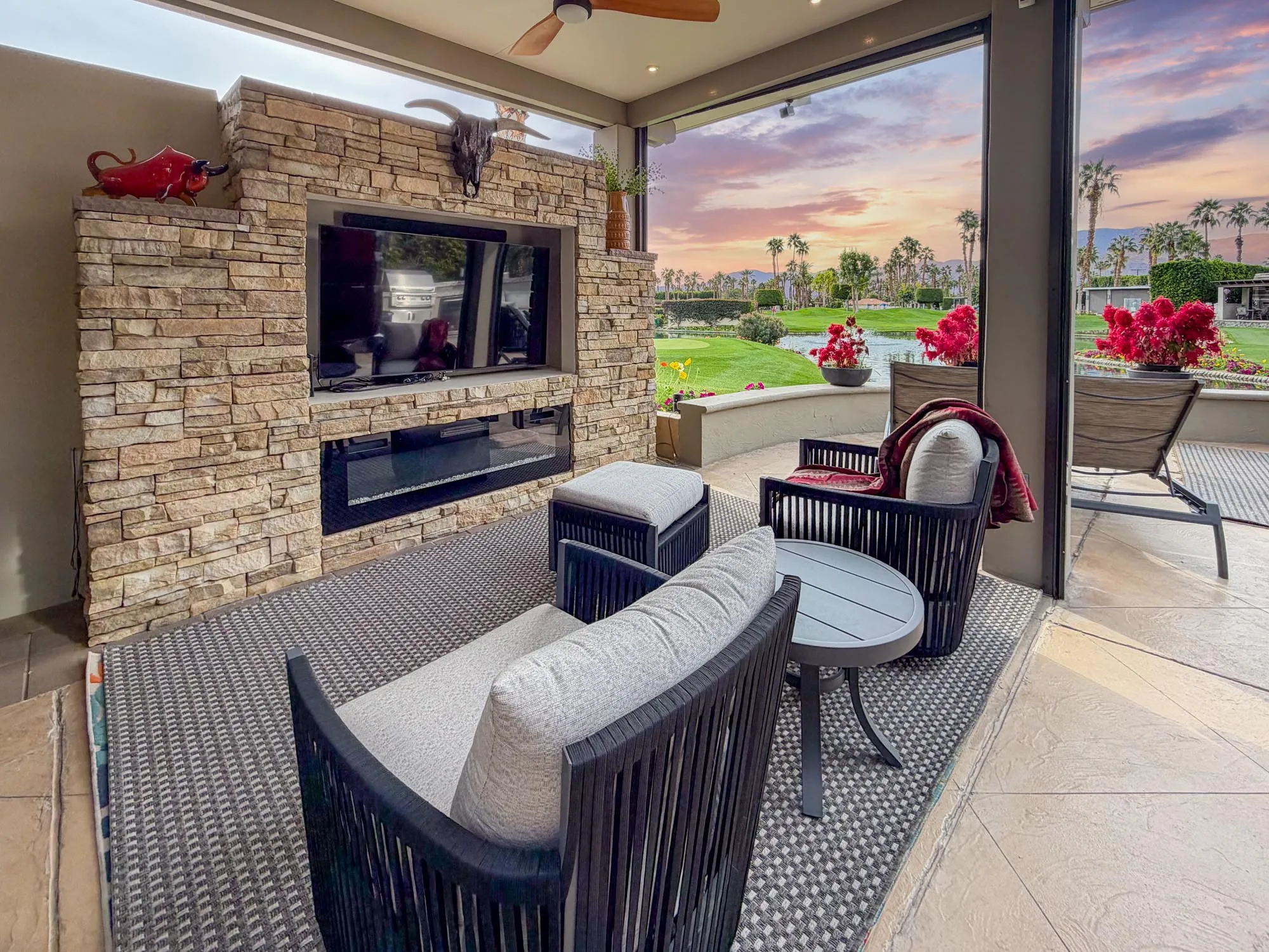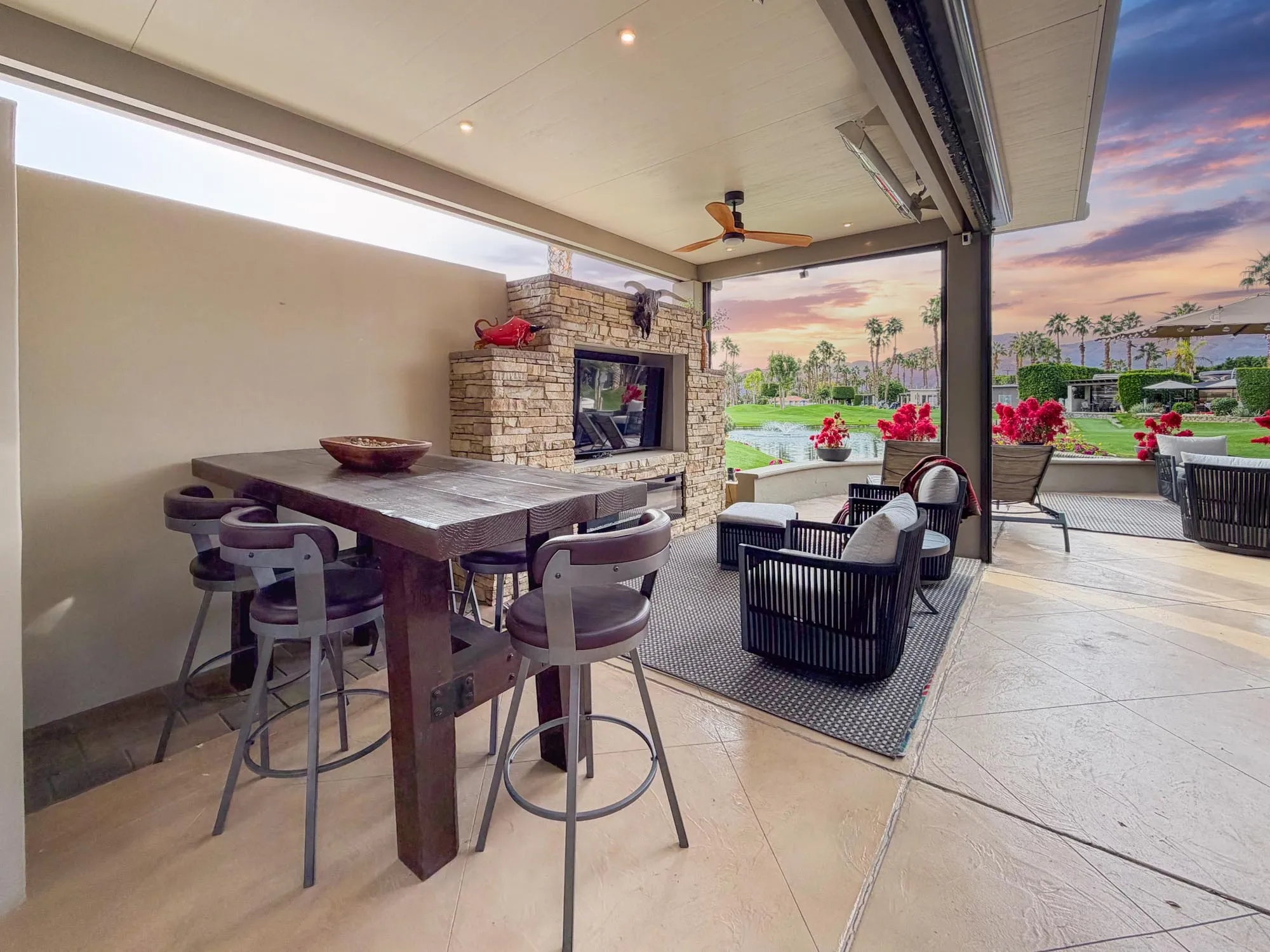 Additional highlights include a dining table with six chairs, fire table with seating, chaise loungers, large umbrella, and a spacious rear relaxation area. South-facing with the coach windshield to the north, this lot is a short walk to the clubhouse and offers tranquil fountain sounds and expansive views for refined resort living.