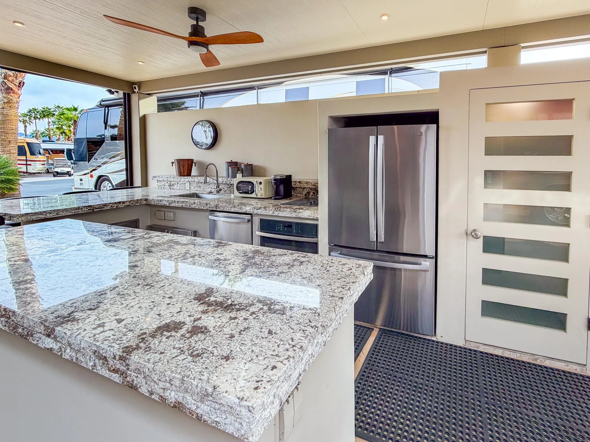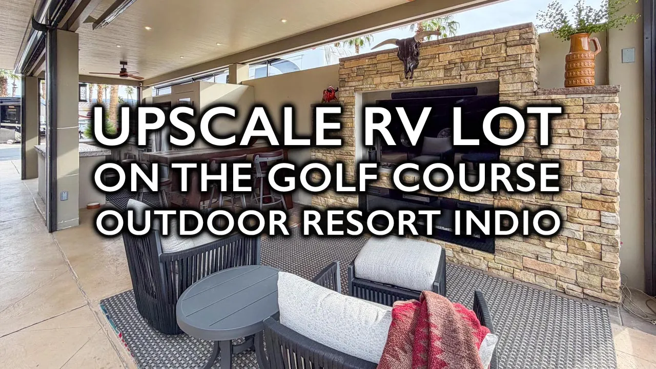 This upgraded pergola RV lot at Outdoor Resort Indio offers a desirable southern exposure with sweeping mountain, lake, and golf course views in a very private setting. The long pergola features a large granite outdoor kitchen with island, five-seat built-in bar, stainless sink with hot water and disposal, oven, dishwasher, and abundant storage—ideal for entertaining.