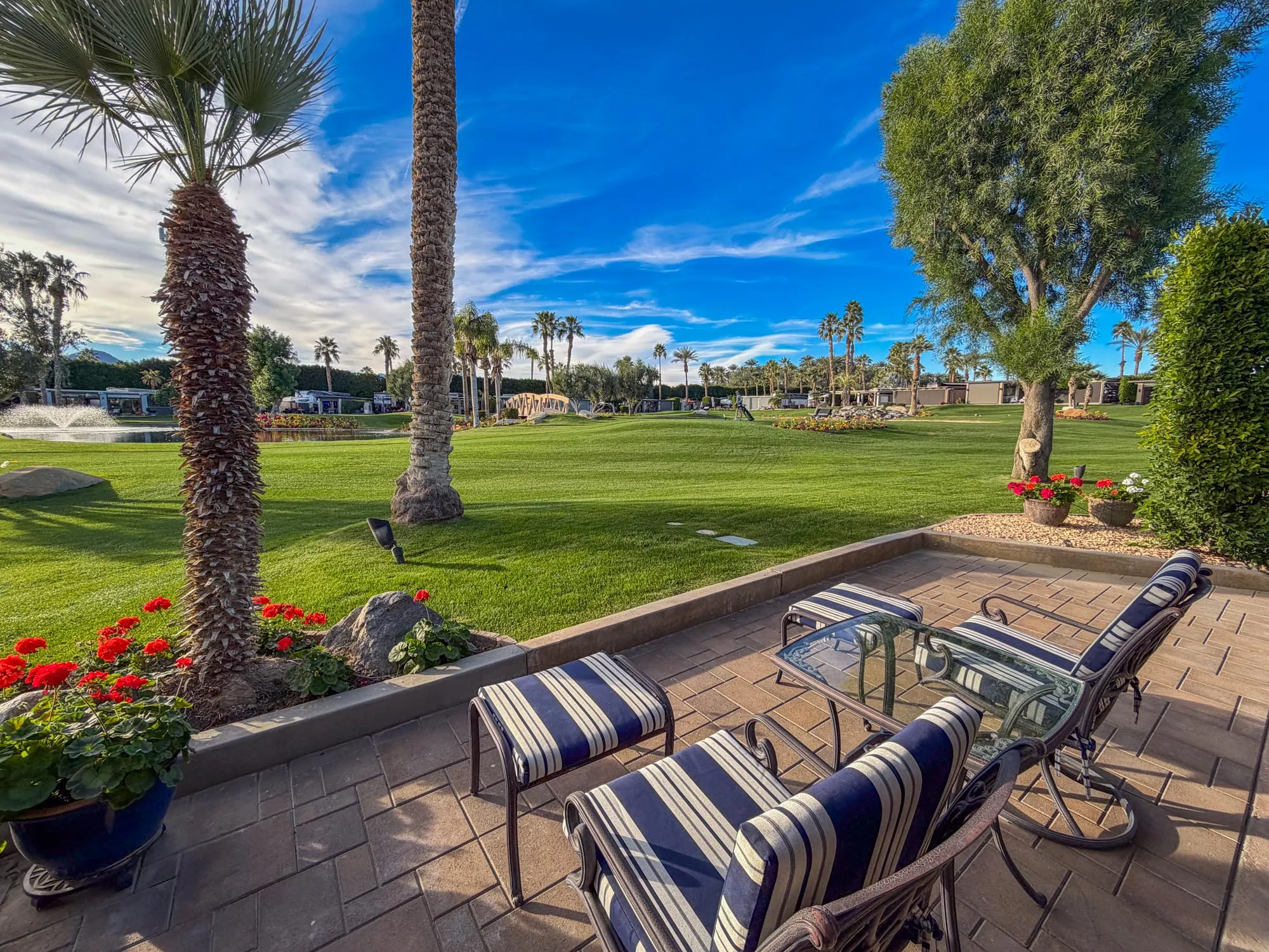 Tucked behind privacy hedges and a landscaped wall, this private, lot opens dramatically to sweeping views of the golf course, shimmering lakes, waterfalls, fountains, and the Santa Rosa Mountains beyond. It’s a scene you’ll never tire of—especially from the comfort of your 8-seat outdoor lounge and dining area.