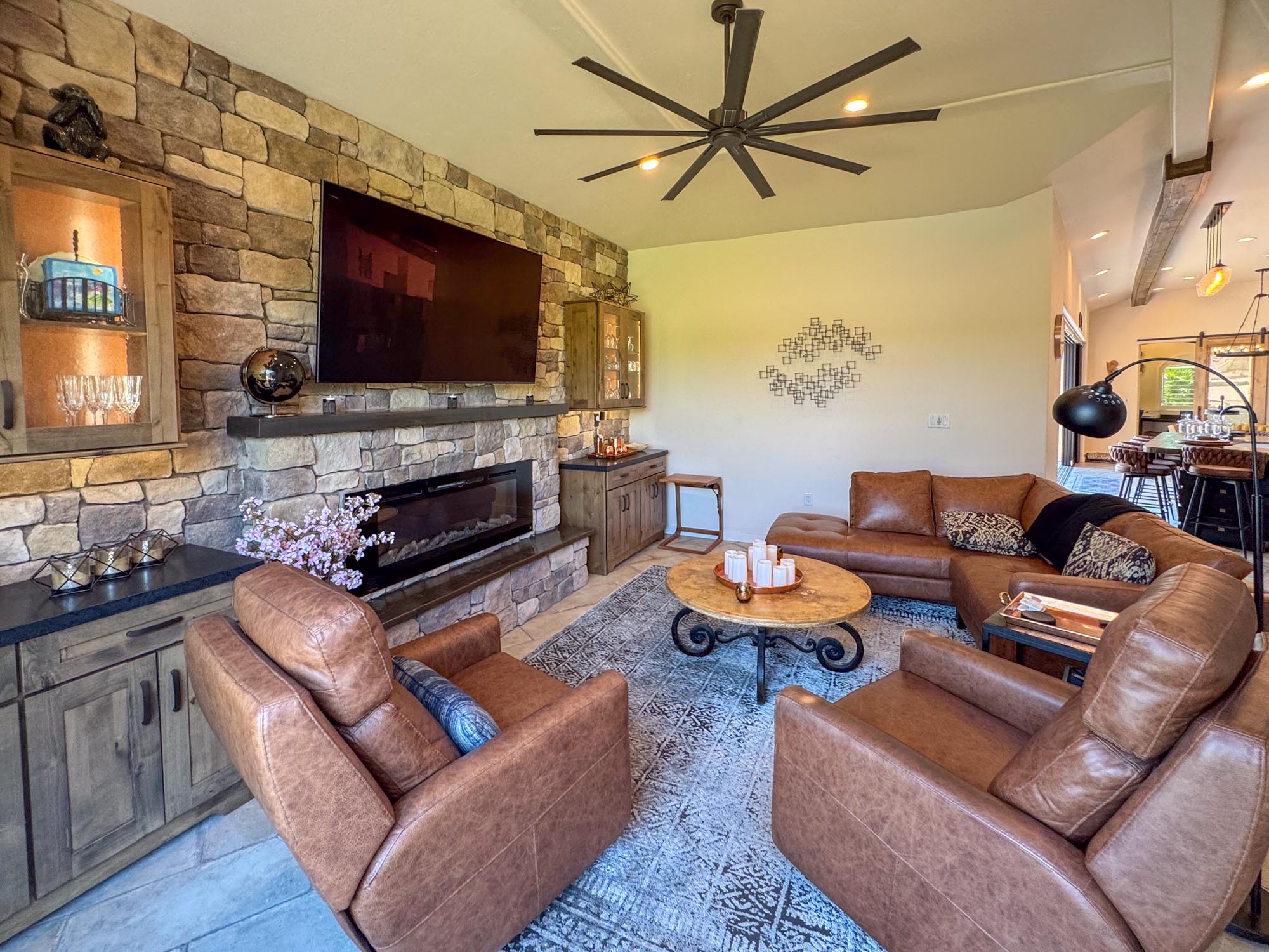 In the living area, a natural stone wall and mantle frame the fireplace, and provides a home for a large screen TV. Opposite this, a built-in wine rack sits above a matching storage cabinet topped with black granite, designed to compliment the kitchen area. Sideways sliding sunscreens and abundant storage can be found throughout.