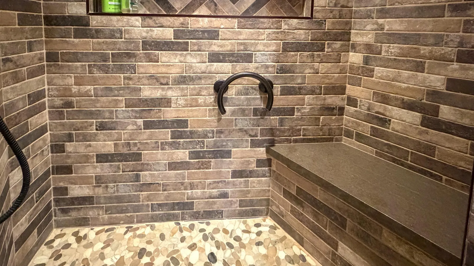 High-end casita RV lot with warm custom brick, stone, and tile finishes