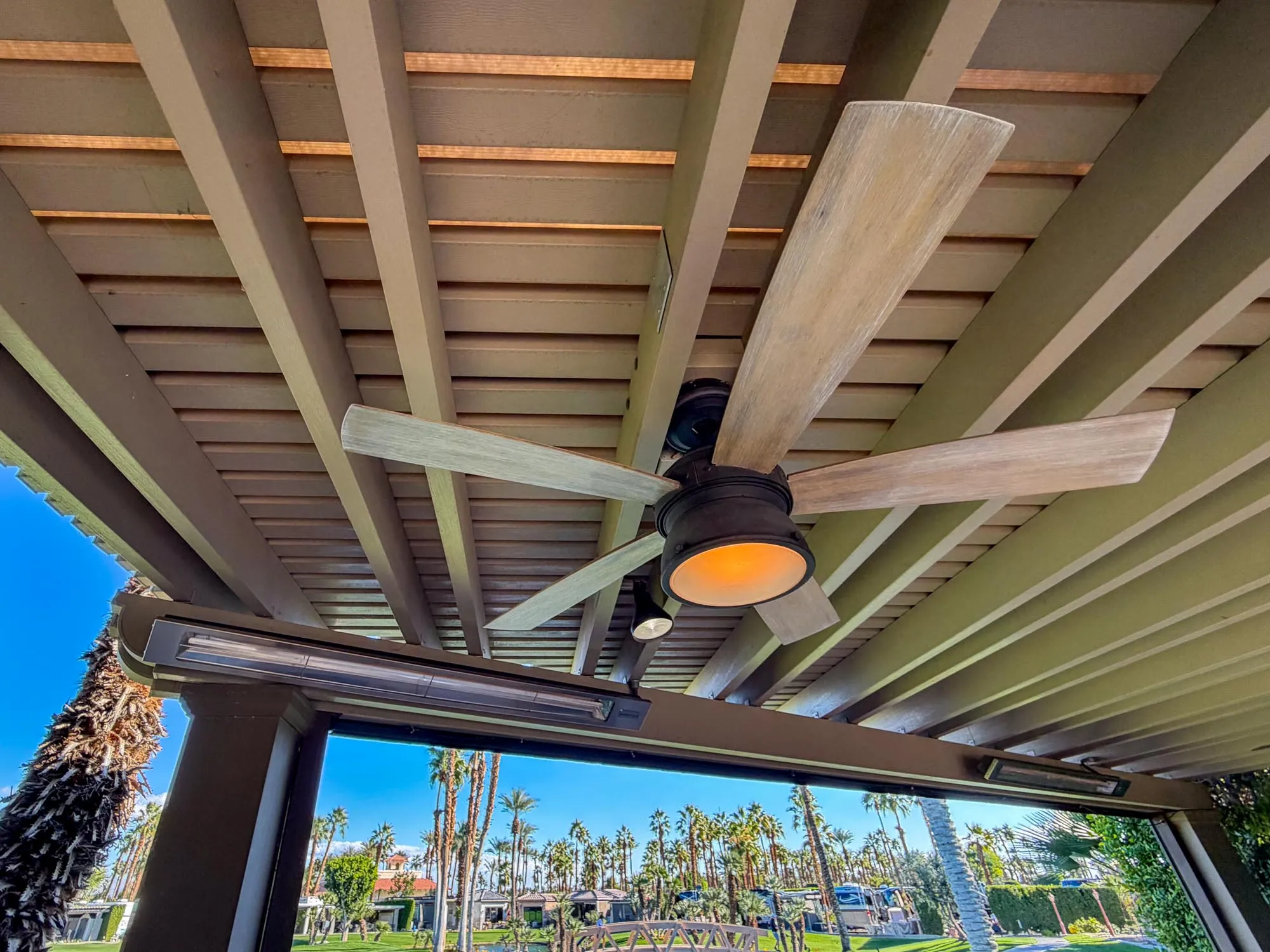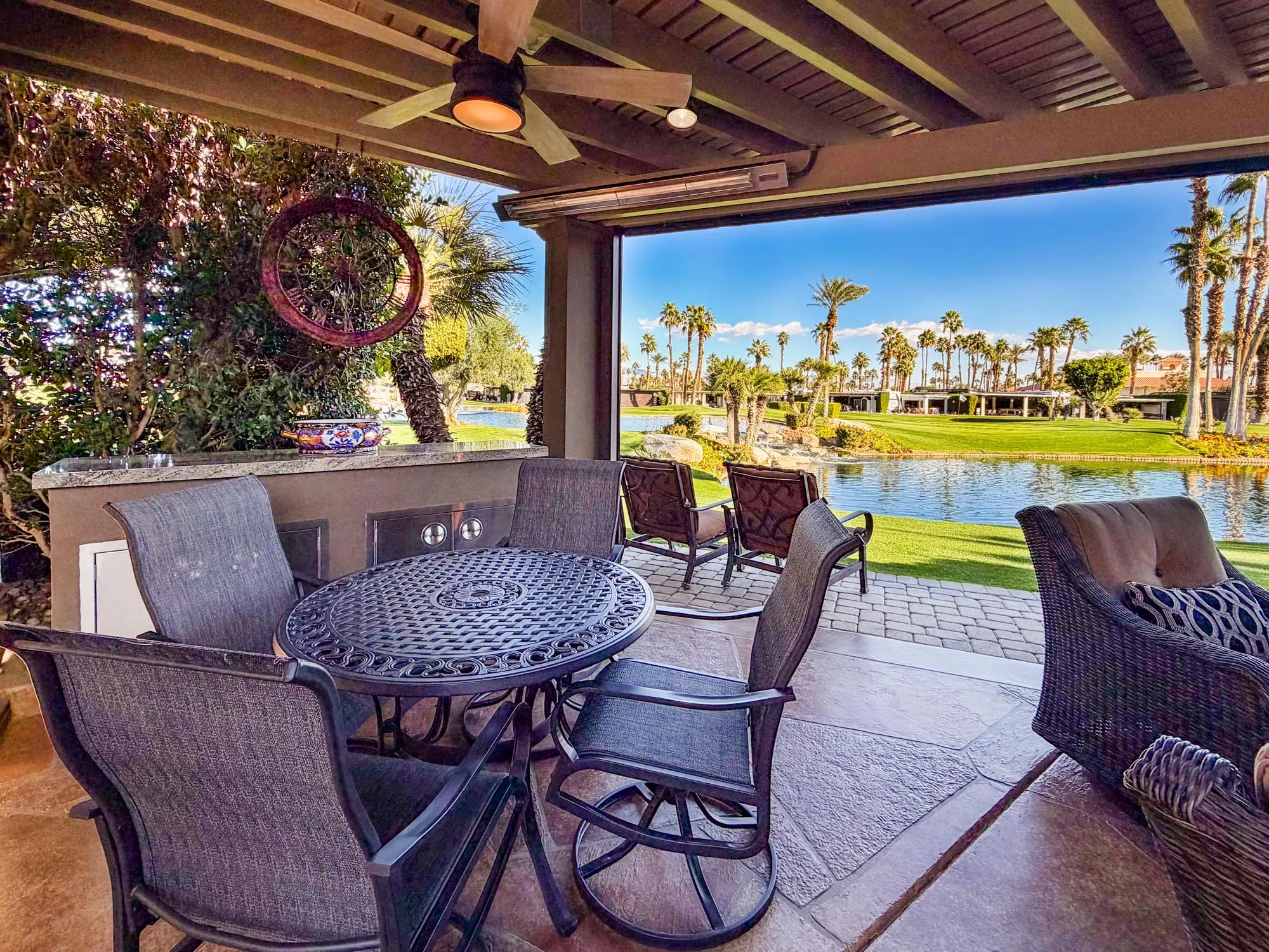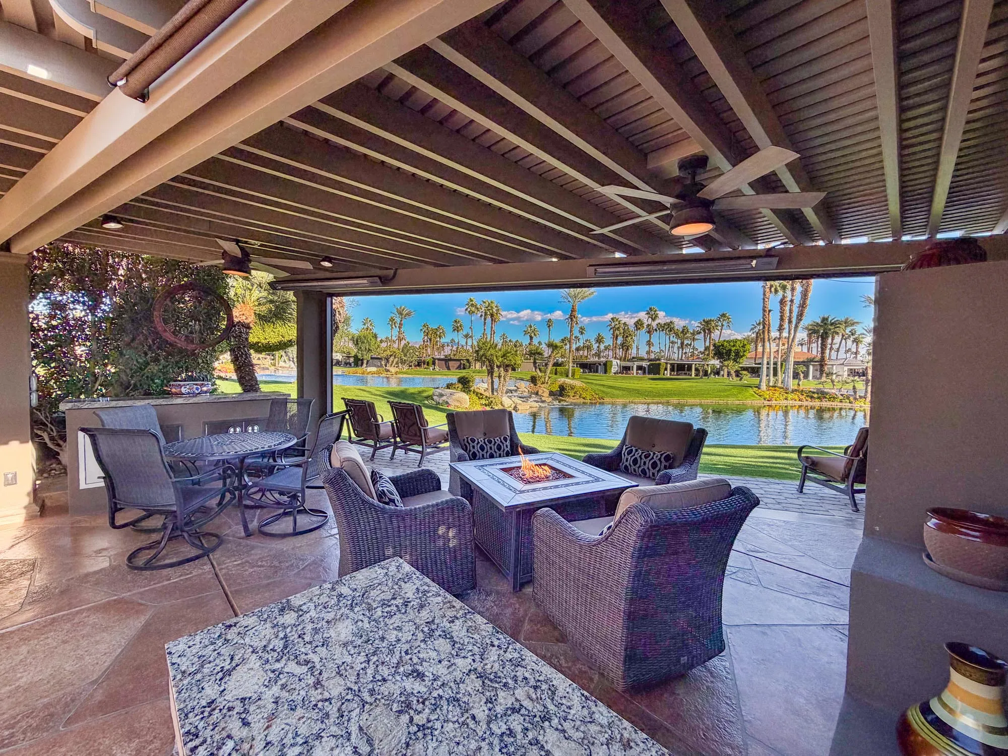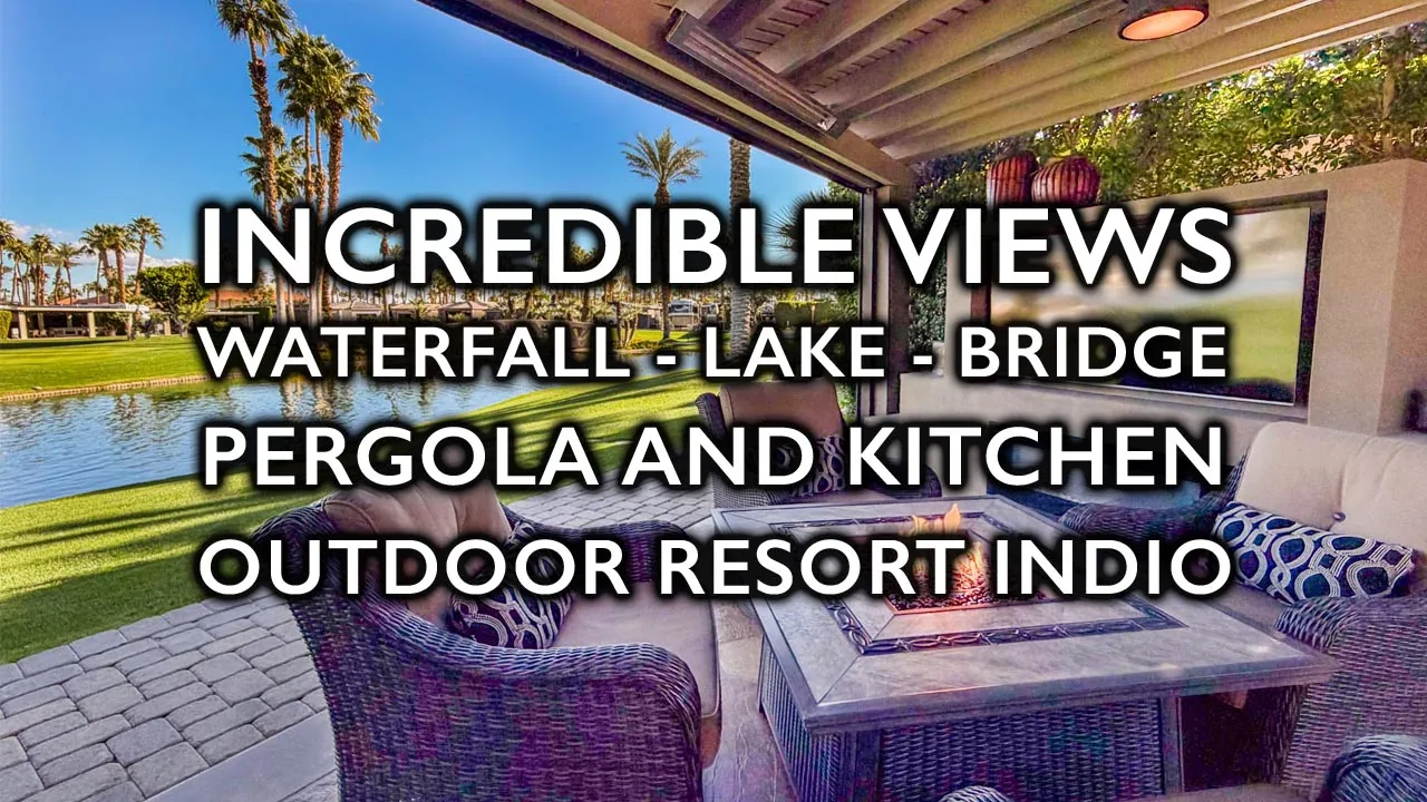 An entertainment center with fireplace sits beneath the pergola, perfectly positioned with the lake and waterfall centered behind the lot. Additional highlights include a 200-amp electrical upgrade, updated water line, and ample built-in storage. This RV lot delivers privacy, striking views, and upscale finishes in one of Outdoor Resort Indio’s most desirable locations.
