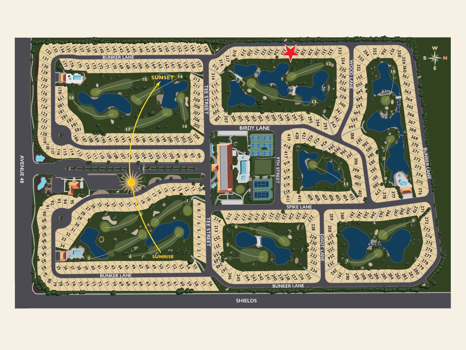 Situated on Wall Street with mature trees that limit the wind. Lot 326 enjoys excellent afternoon shade, no golfer traffic behind the lot, and beautiful morning views of the golf course and lakes, along with soothing fountain sounds and striking moon views. The pergola conforms to current architectural guidelines, and appliance documentation is available.