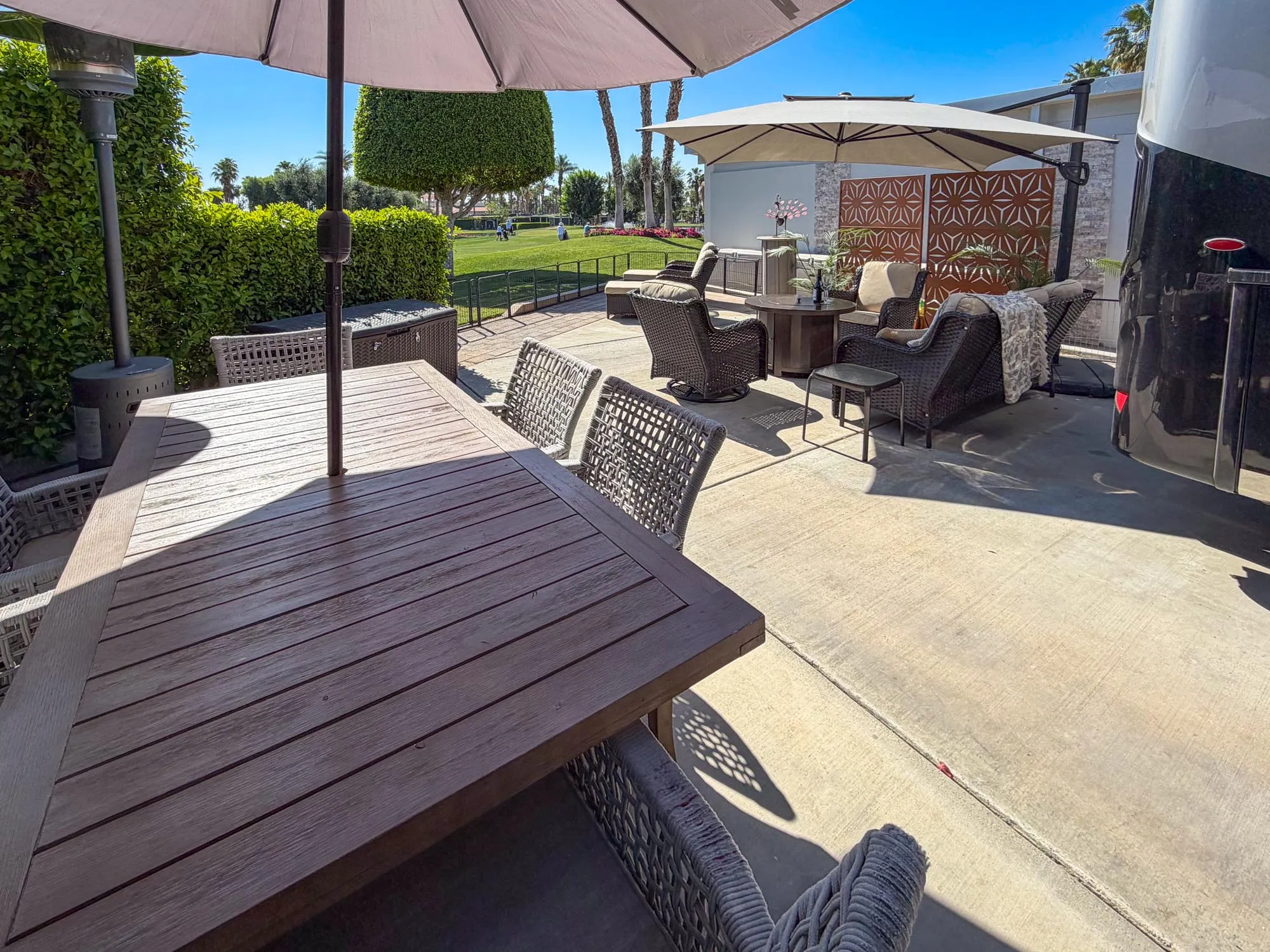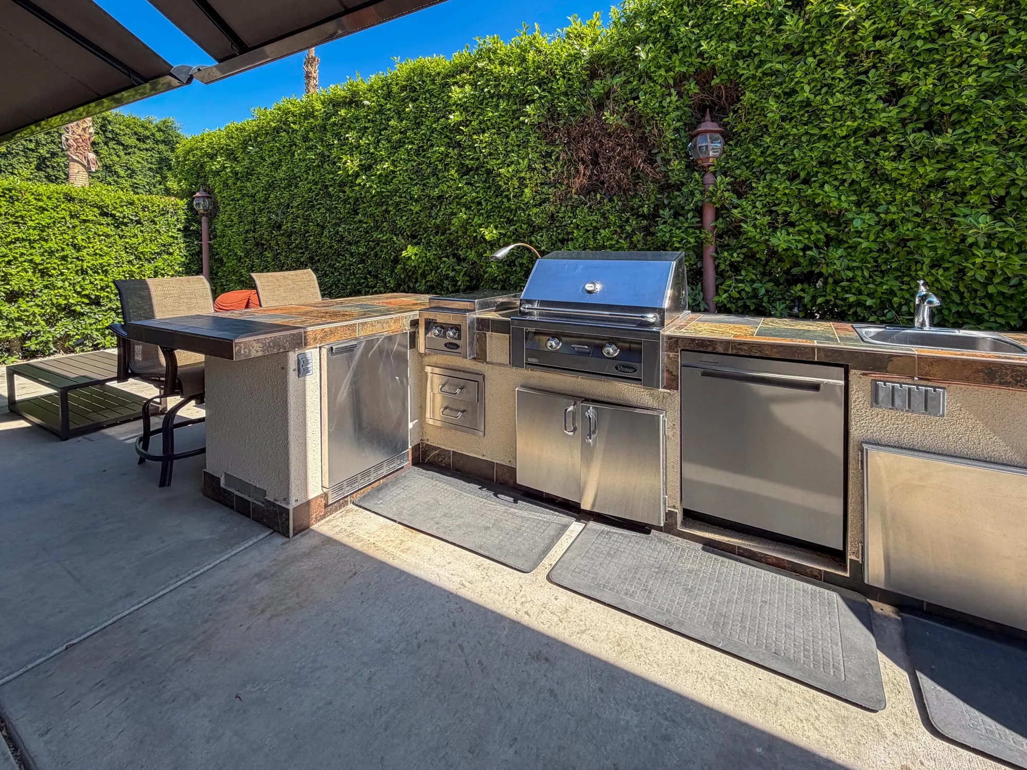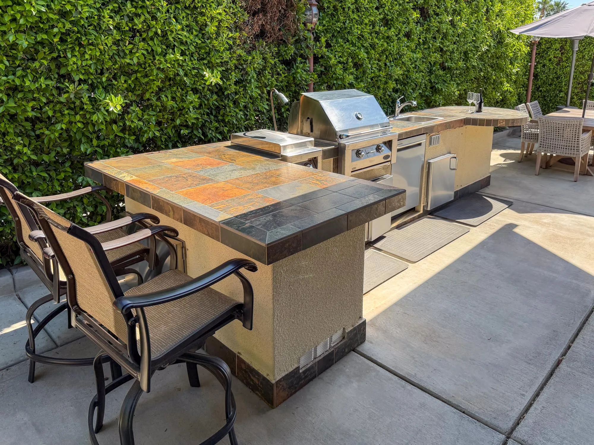 Designed for entertaining and relaxed desert living, the large outdoor kitchen features hot water, dishwasher, mini fridge, BBQ, two-burner cooktop, and sleek stainless steel cabinetry and doors. The lot is being offered furnished and includes a fire table with three matching chairs, loveseat, ottoman, and end table, along with an outdoor dining table with umbrella and eight chairs. A cantilever umbrella, mushroom heater, and custom covers for all furniture enhance comfort and protection.