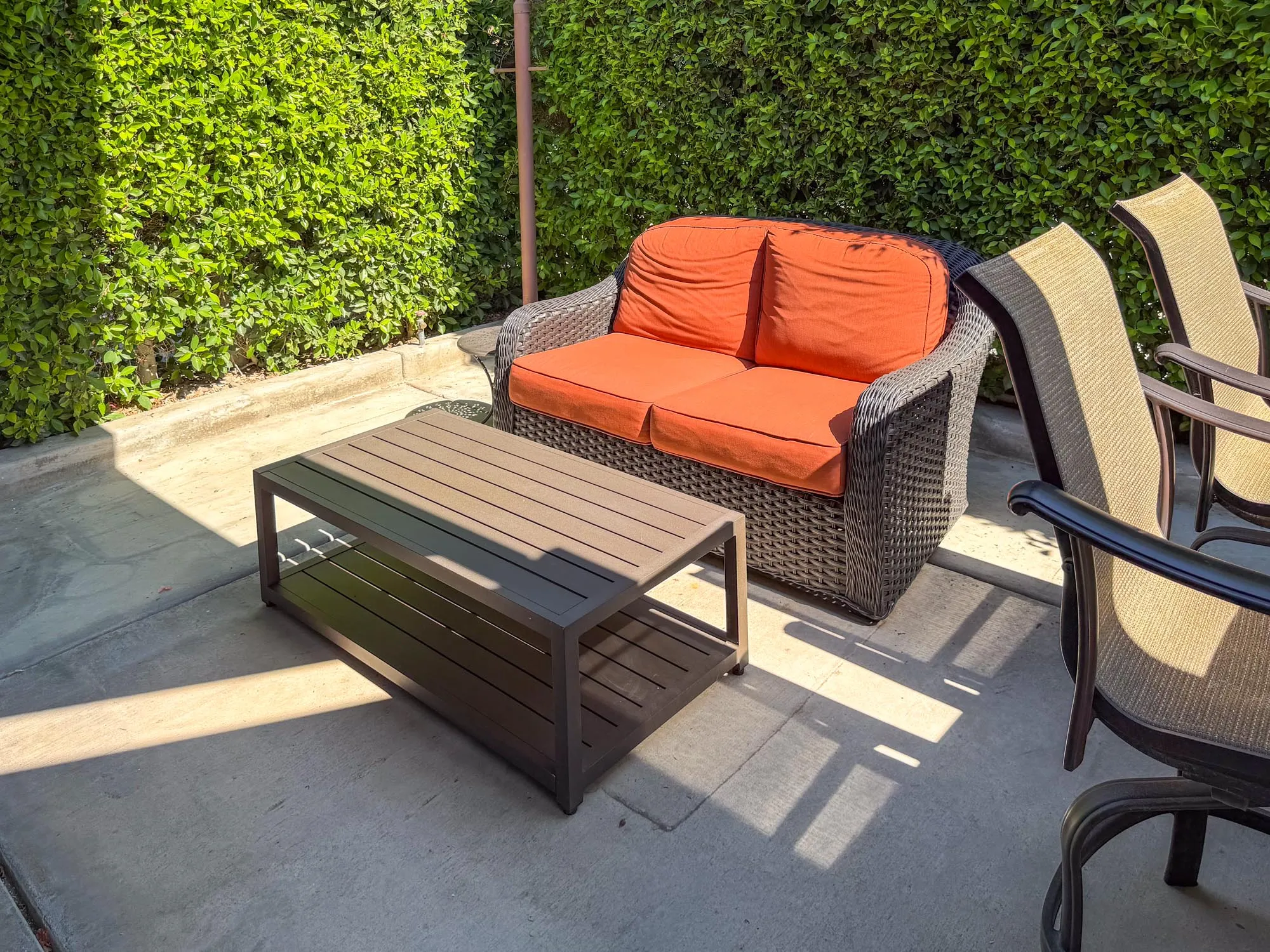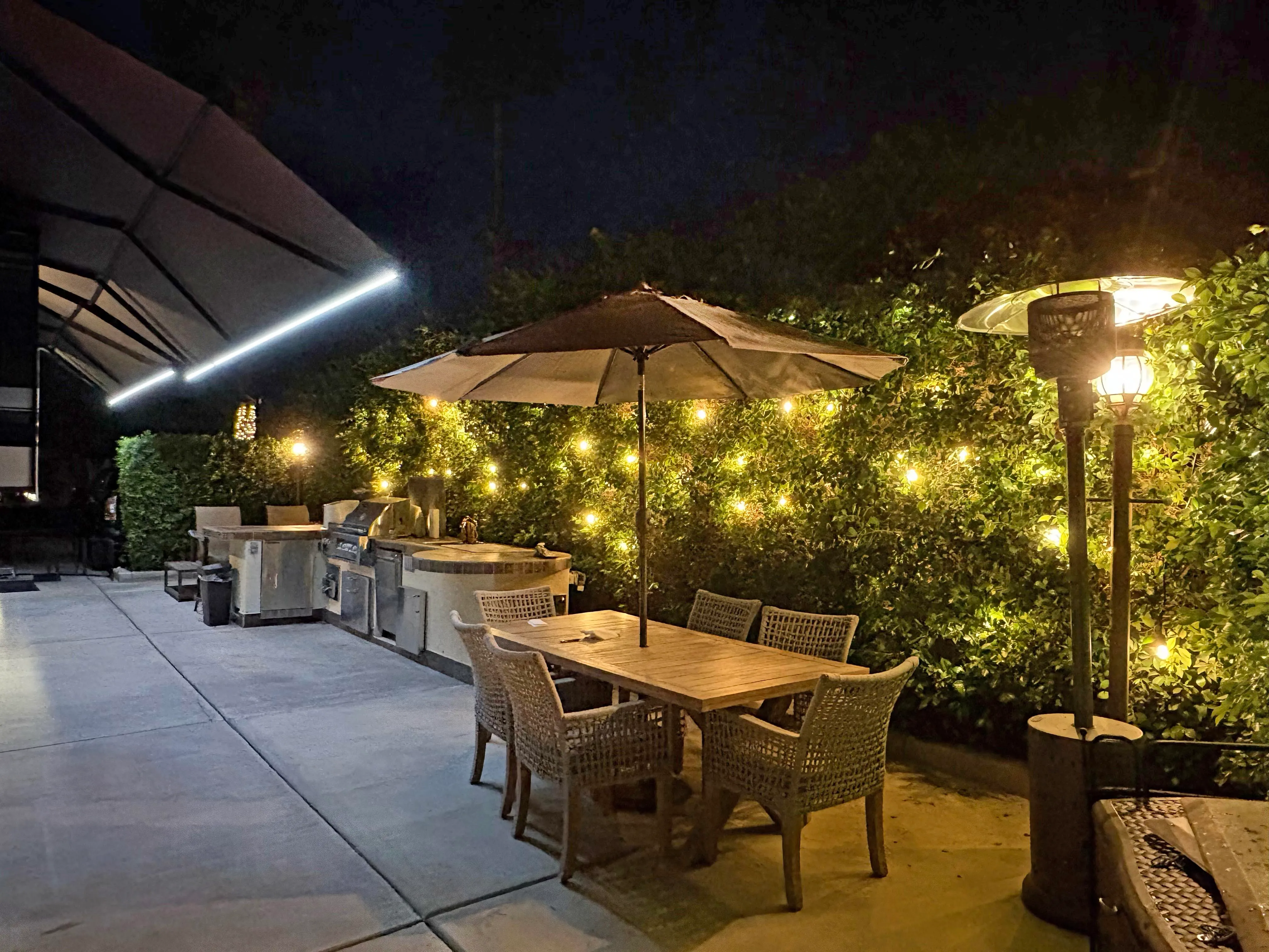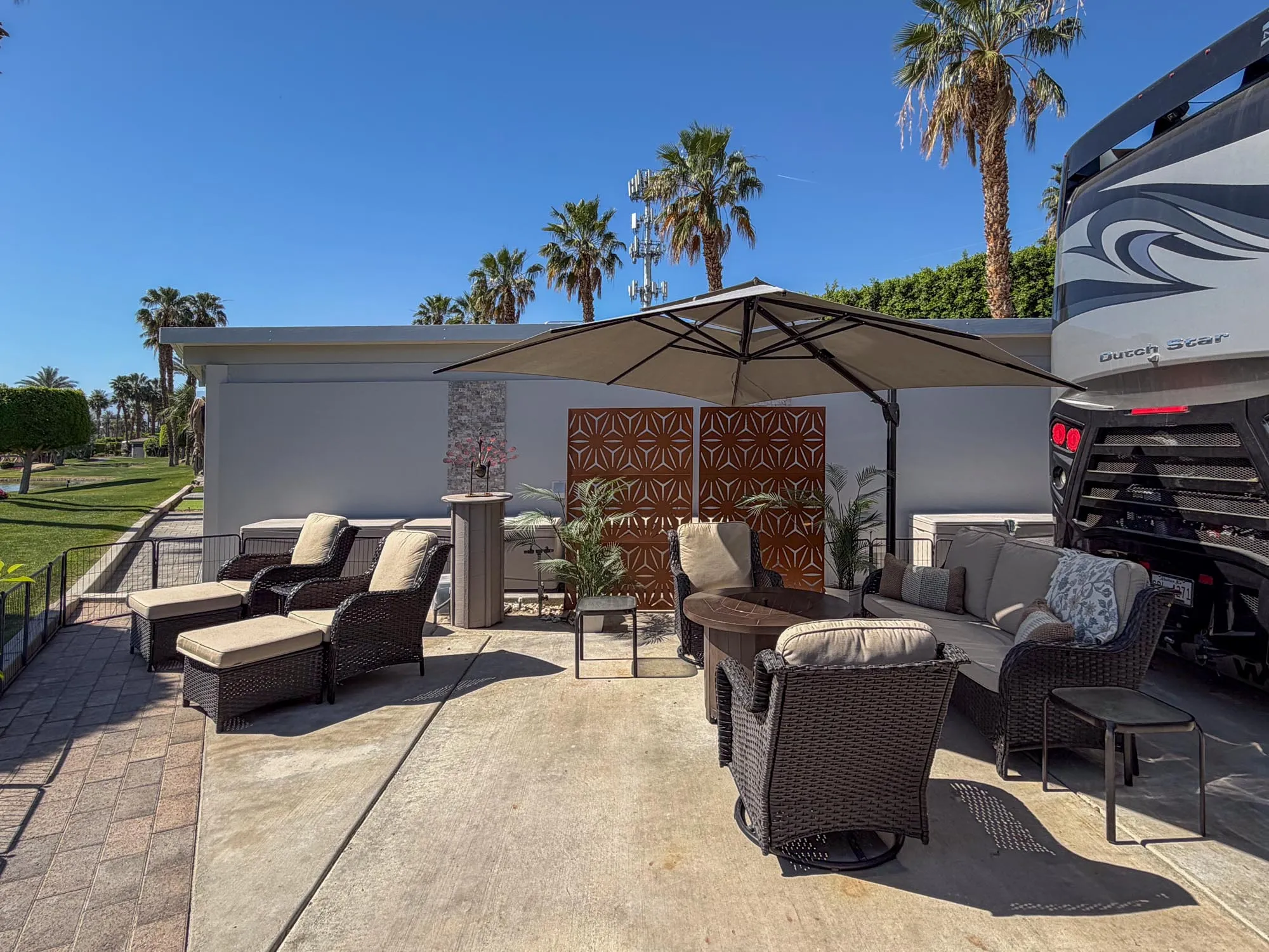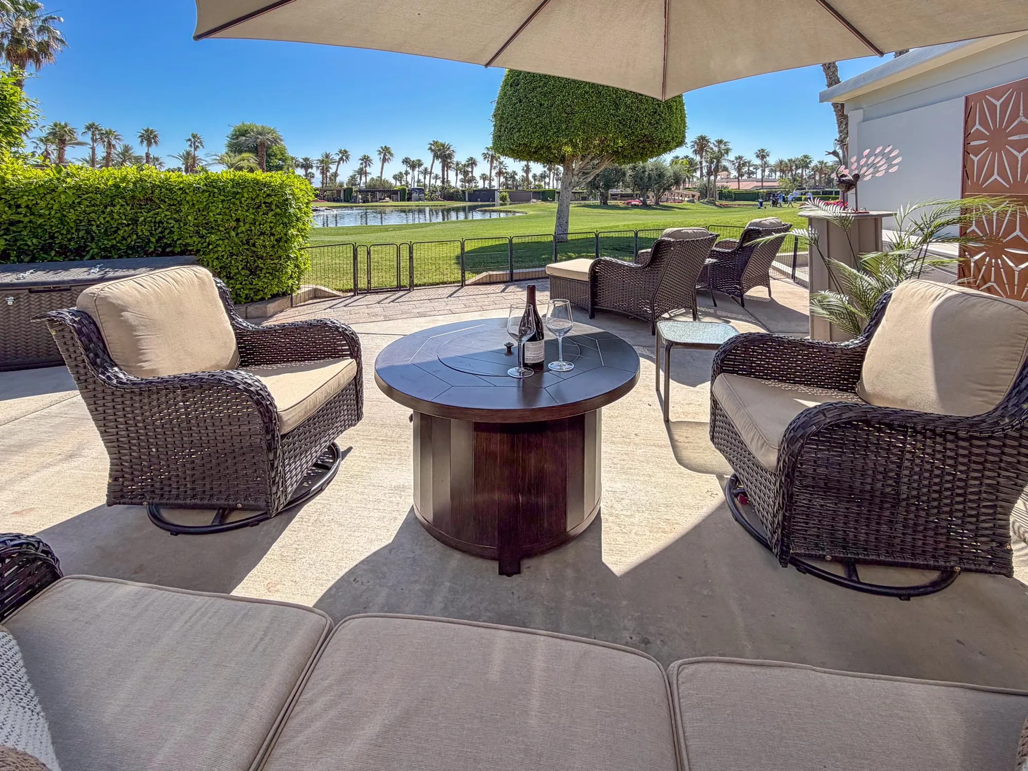 Designed for entertaining and relaxed desert living, the large outdoor kitchen features hot water, dishwasher, mini fridge, BBQ, two-burner cooktop, and sleek stainless steel cabinetry and doors. The lot is being offered furnished and includes a fire table with three matching chairs, loveseat, ottoman, and end table, along with an outdoor dining table with umbrella and eight chairs. A cantilever umbrella, mushroom heater, and custom covers for all furniture enhance comfort and protection.