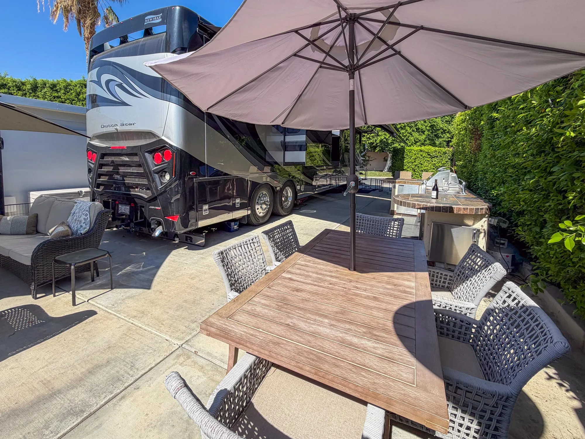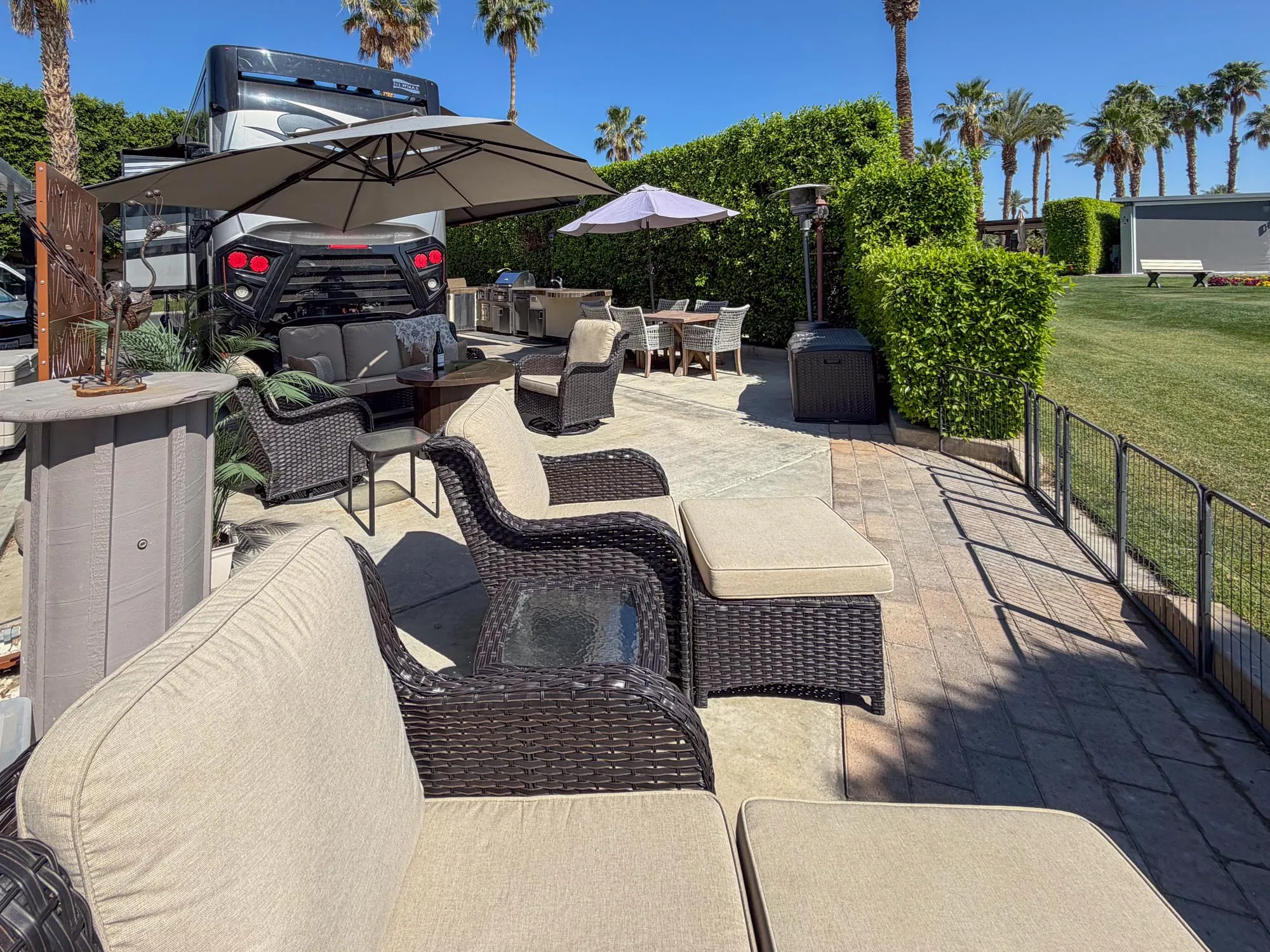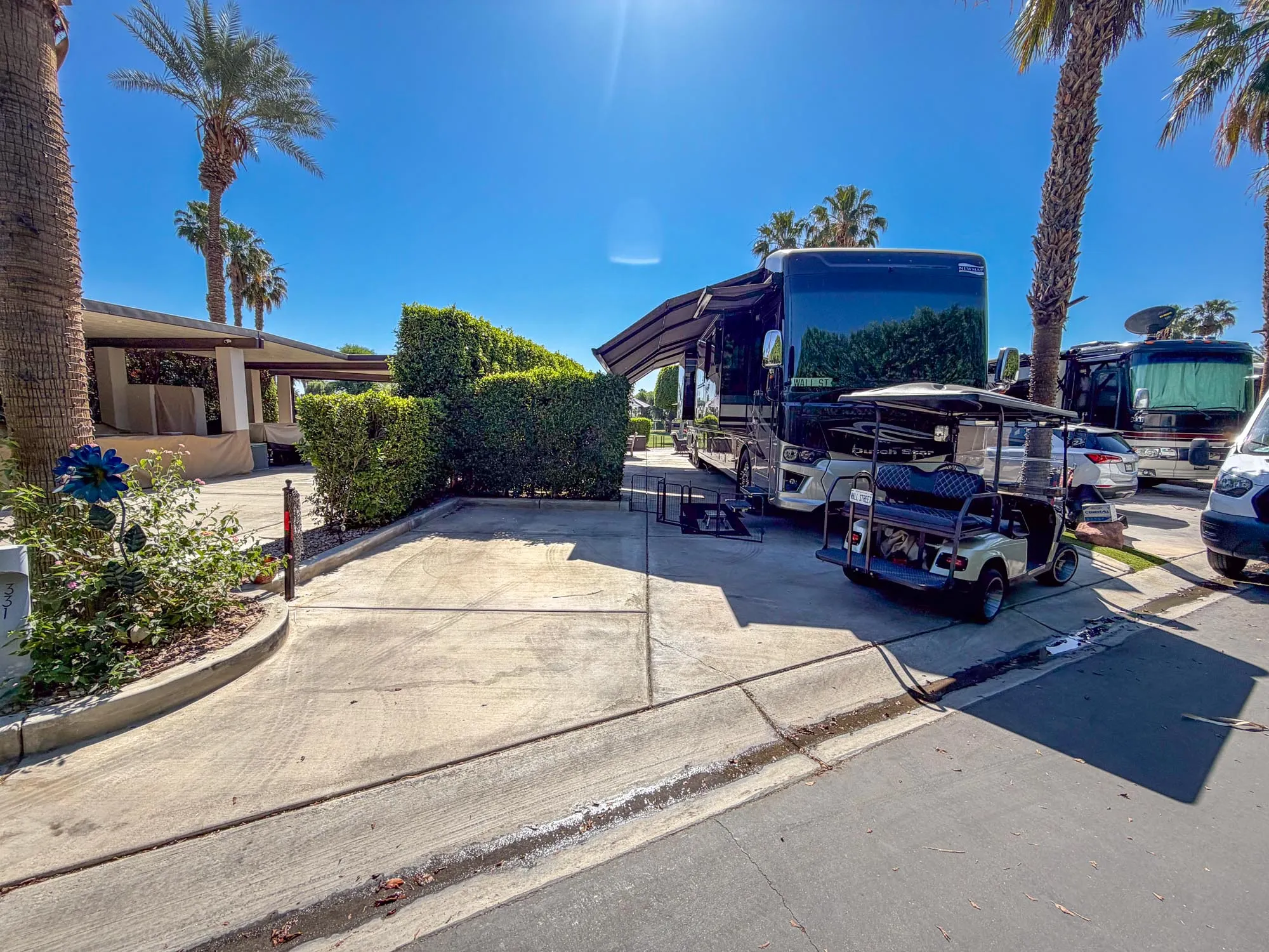 Practical features include mid-lot hookups, three storage bins, hedge lighting stored in the storage box, and the dog fence that will remain. An included golf cart adds convenience for getting around this premier Class A motorcoach resort. Lot 331 combines location, functionality, privacy, and panoramic golf course and mountain views — all within the sought-after community of Outdoor Resort Indio.