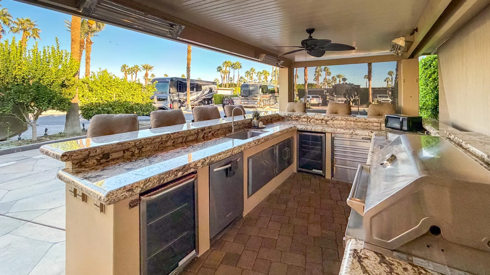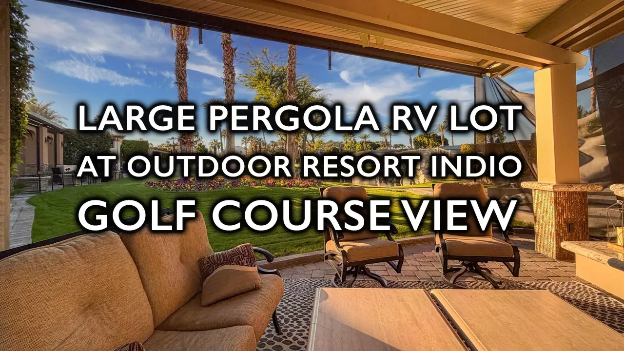 This spacious 2,613 sq ft lot captures one of the most beautiful vistas in Outdoor Resort Indio—stretching across the scenic Phase 7 golf course with its shimmering ponds, graceful bridges, and cascading waterfalls. The location offers a sense of serenity and space, with no shortage of resort convenience—just a short walk from a nearby satellite pool and all the amenities that make ORI such a special place to spend the winter season. A surfaced RV pad and L-shaped Alumawood pergola with pavers below create the perfect balance of comfort, shade, and style.