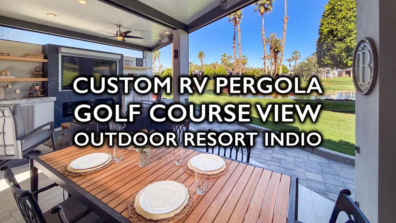 Welcome to Lot 414 at Outdoor Resort Indio, ideally located directly across from the tennis courts and the main clubhouse — placing you steps from the heart of activity while enjoying stunning views over the “Little Six” golf course and the Chocolate Mountains. This exceptional lot showcases a custom L-shaped pergola (just three years old) with an insulated roof, privacy glass, and a unique custom roof overhang over the bar area — a distinctive architectural feature that sets this property apart.