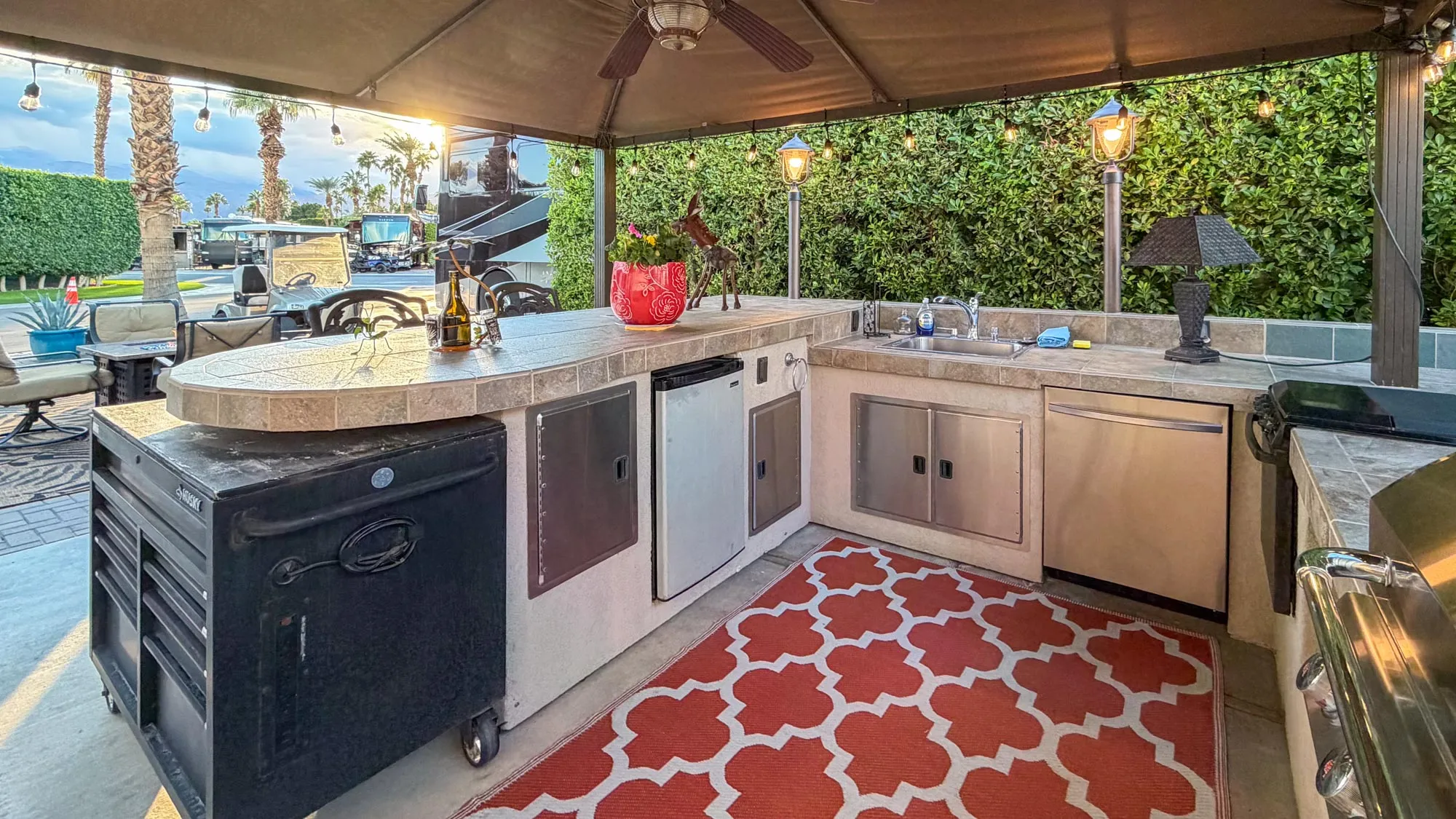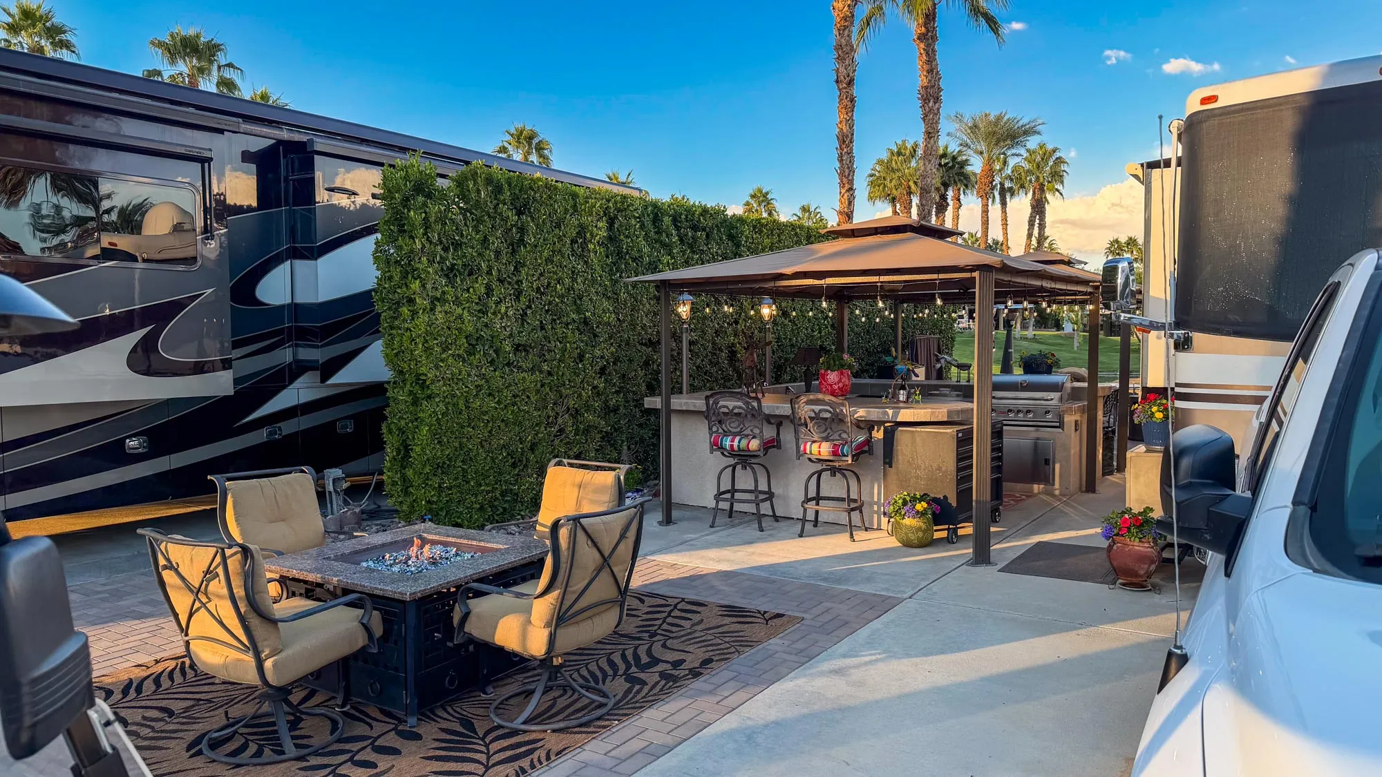 Designed for both entertaining and relaxation, the well-maintained outdoor kitchen features a built-in grill, bar, and ample storage, complemented by two Sunbrella sun covers with ceiling fans for all-day comfort. And a bonus, there are two new covers stored under the countertop when needed. The spacious back area with extended pavers provides the perfect setting to unwind. With updated electrical, beautiful views from both ends, and a peaceful atmosphere, this lot is a rare find for those who want the best of privacy, convenience, and luxury RV living. Note: new water line was just installed on the lot.
