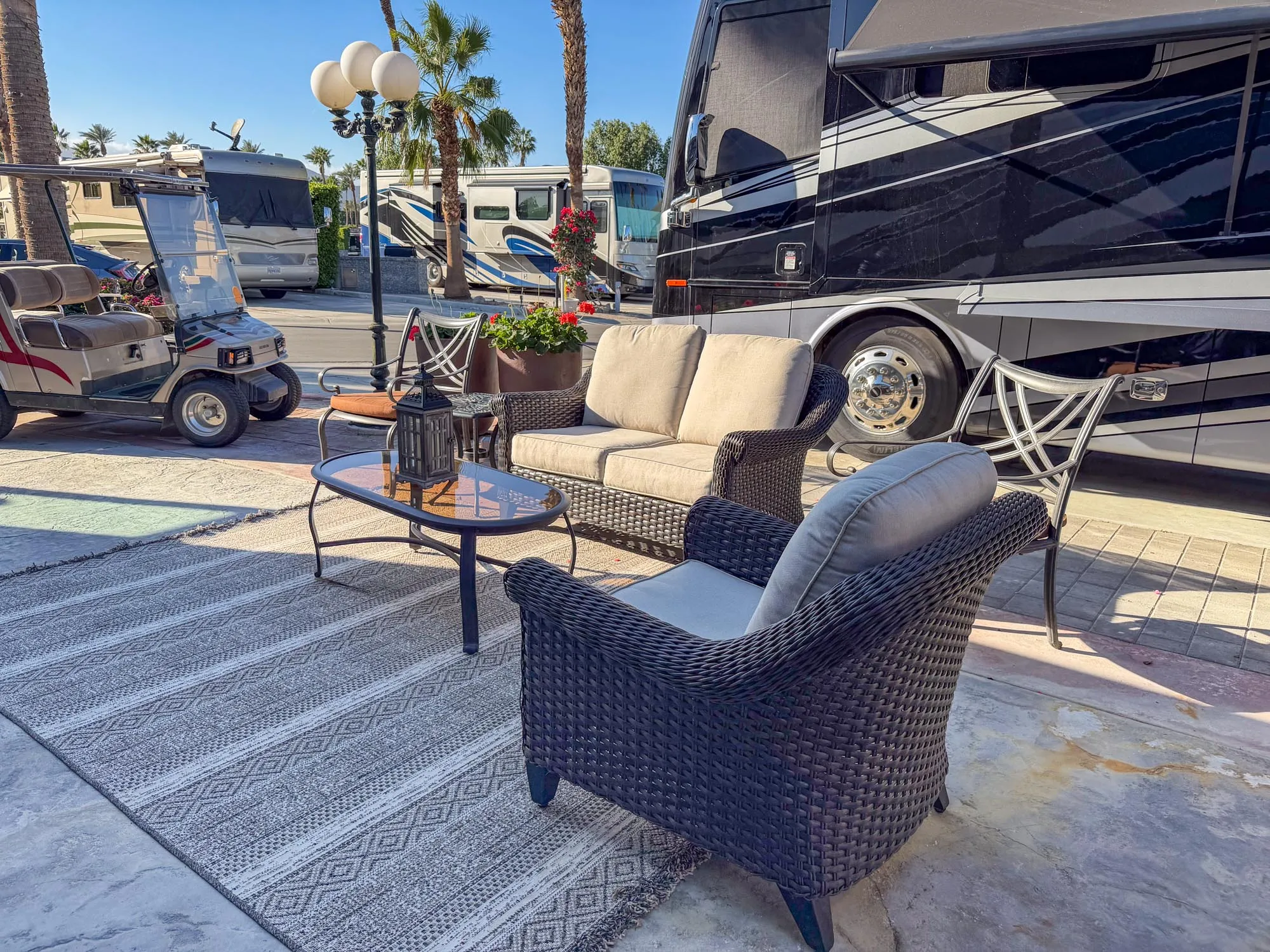 This luxury RV lot at Outdoor Resort Indio offers a unique blend of style, comfort, and resort convenience, designed for relaxed outdoor living and easy entertaining. A gazebo-style sun shelter and extended paver surfaces enhance the width and usability of the lot, creating multiple inviting spaces to enjoy the desert lifestyle.